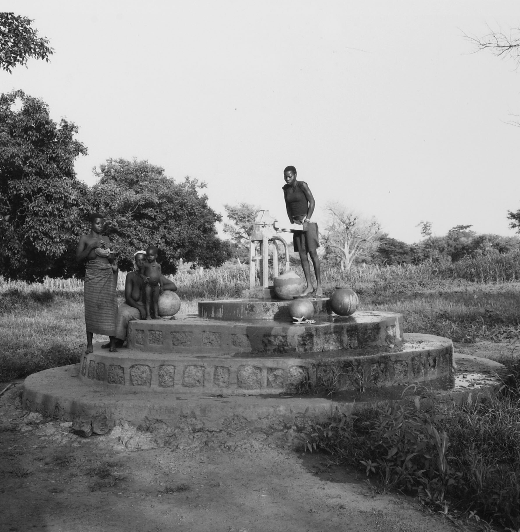 Mossi vullen hun waterpotten bij een moderne waterpu...