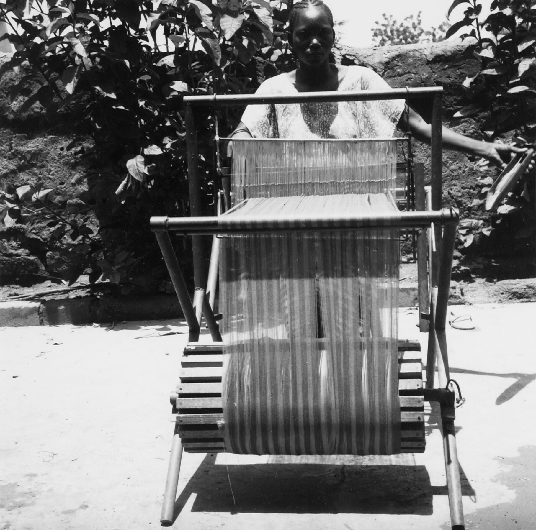 Vrouw aan een weefgetouw dat door de R.K. missie geï...