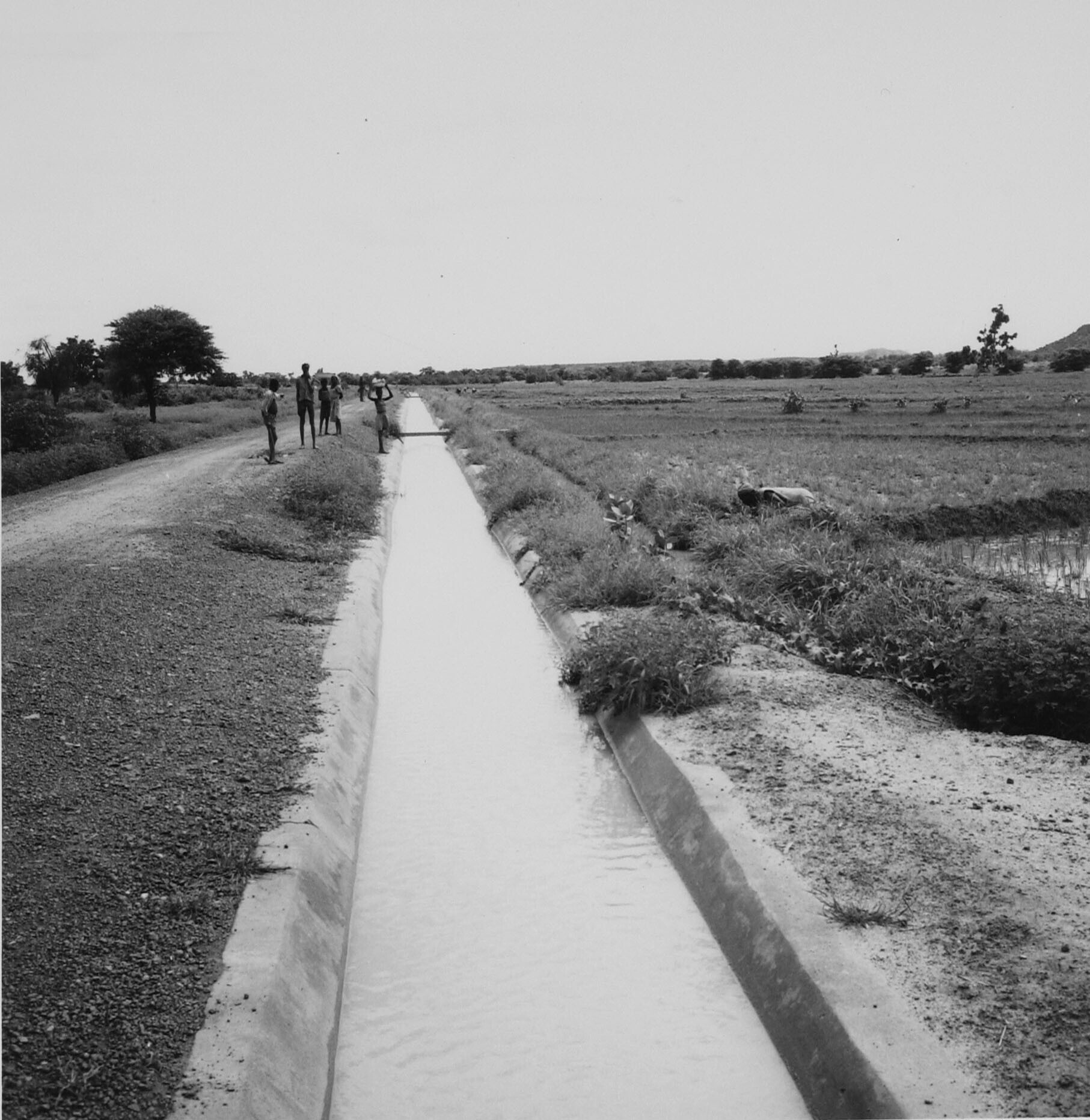 Irrigatiekanaal met rechts de rijstvelden van een ri...