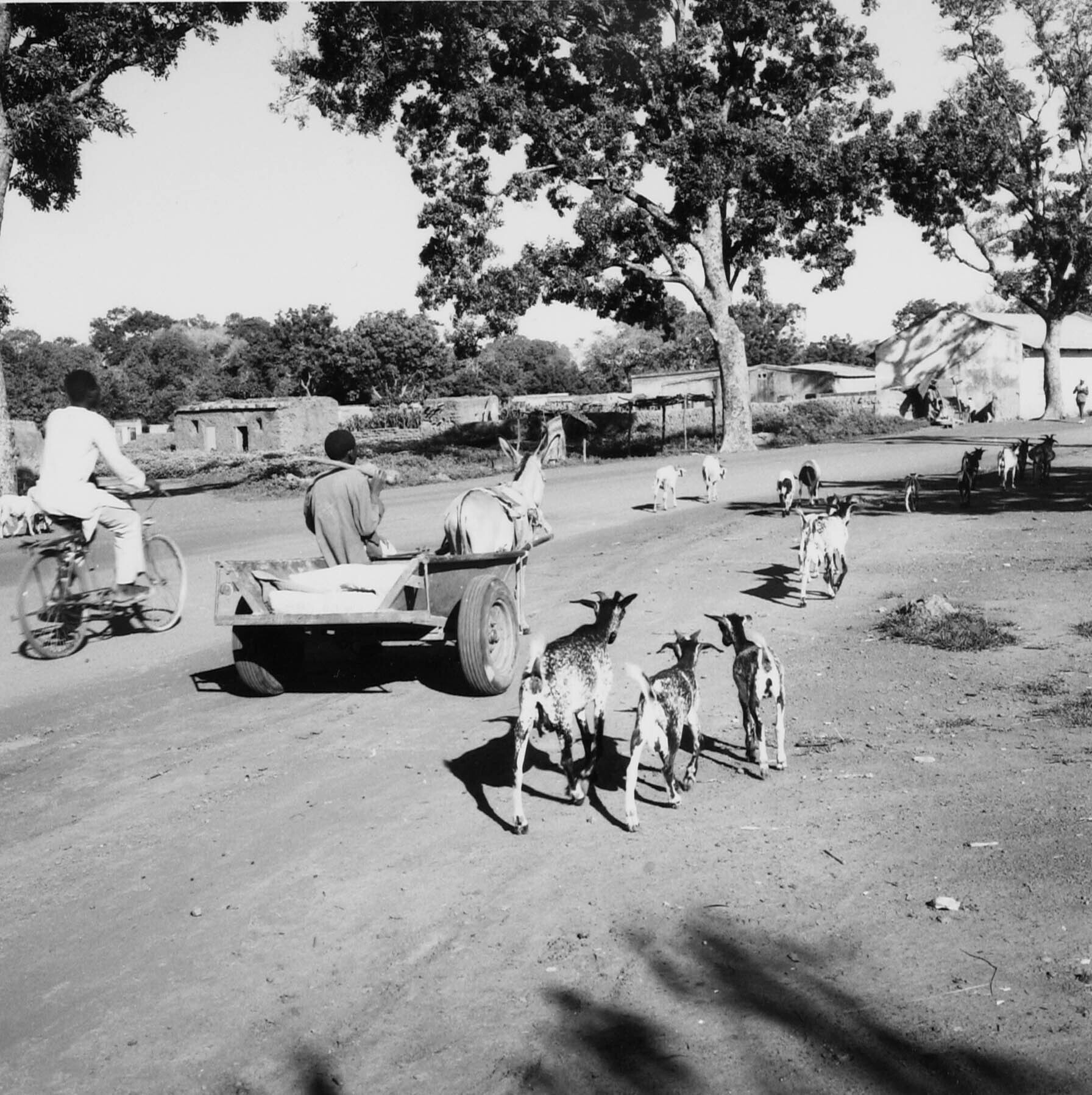 Een man op de fiets, een ezelkar en kudde geiten op ...