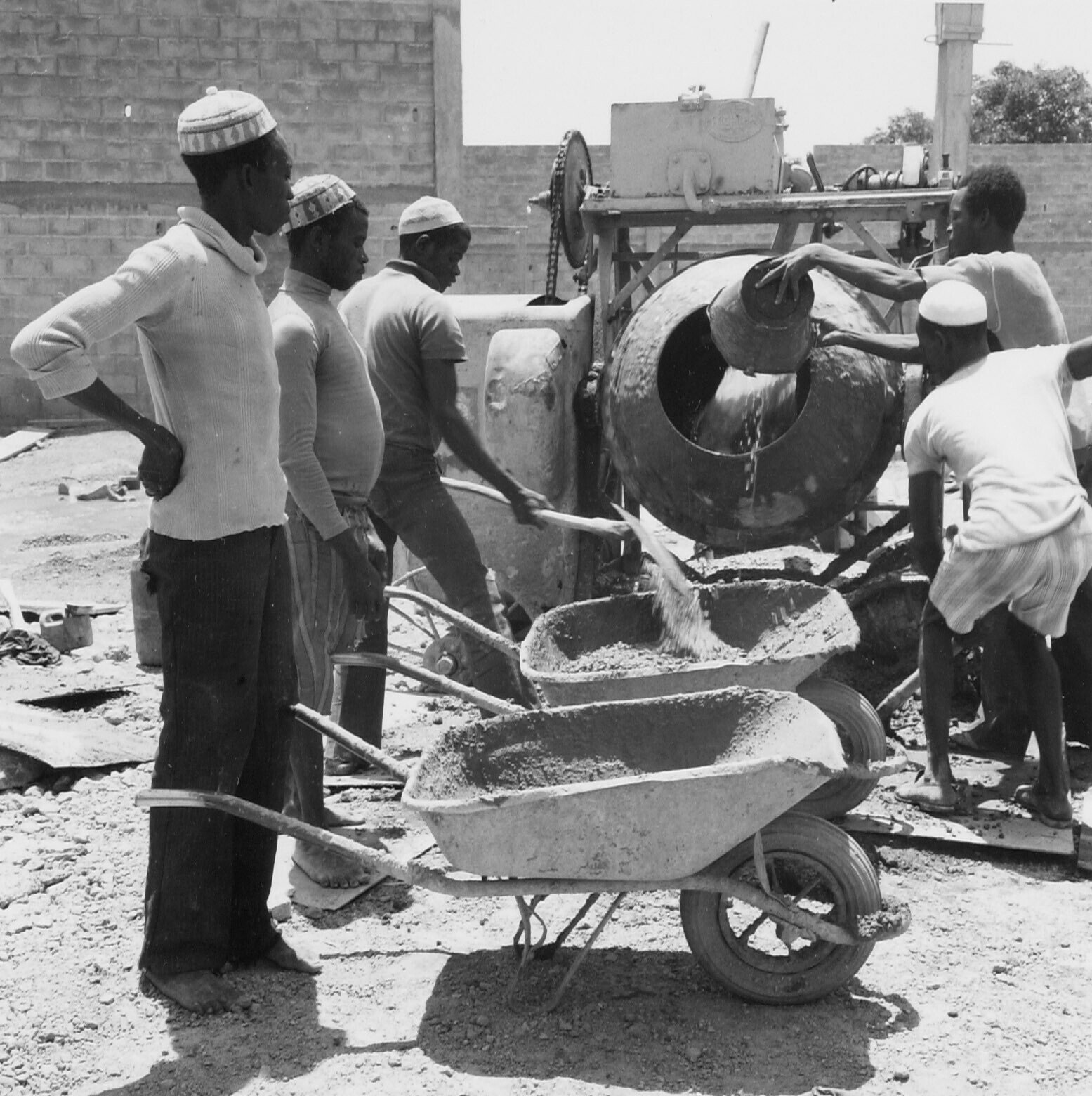 Arbeiders met kruiwagens bij een betonmolen