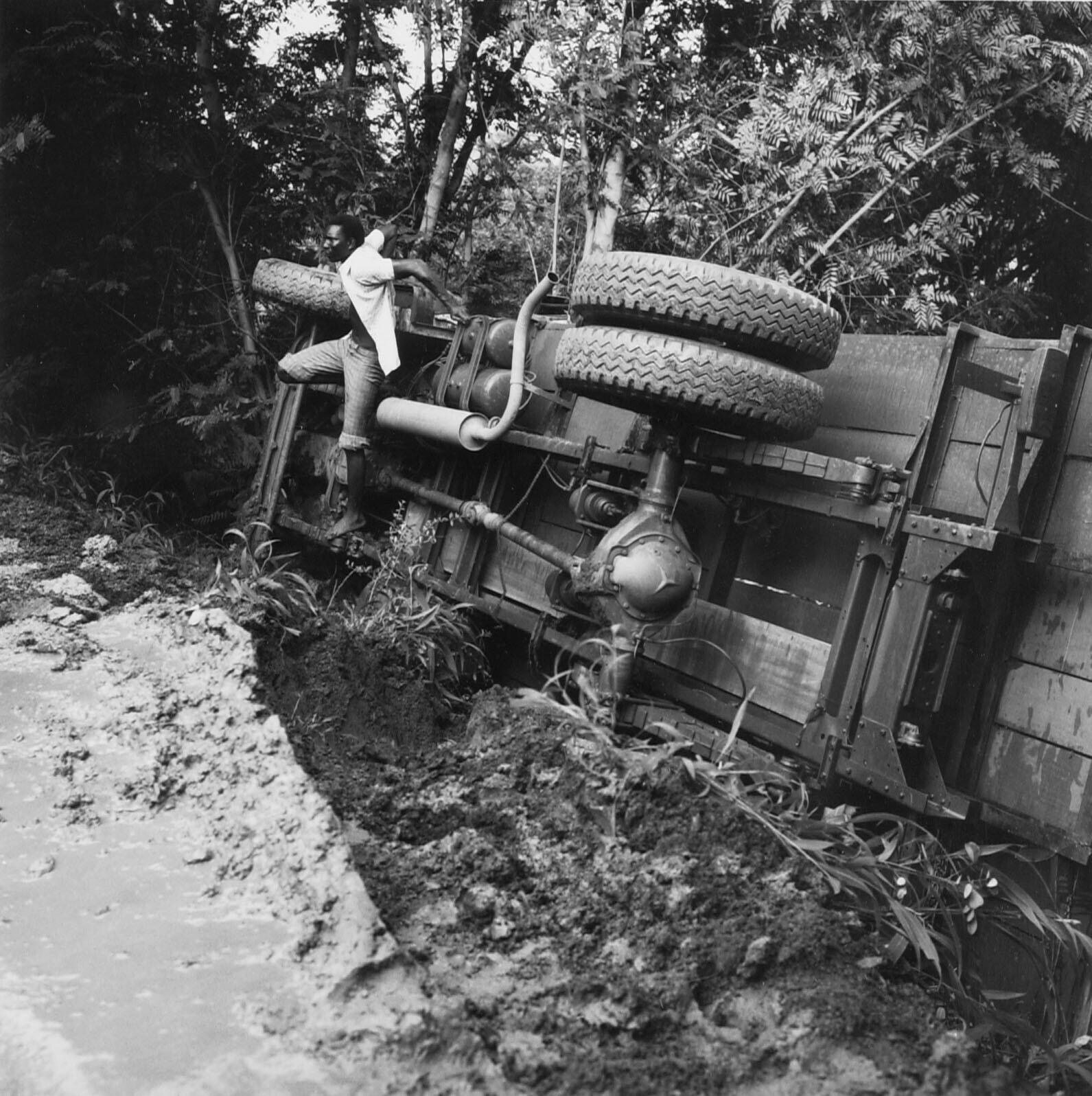 Een vrachtwagen op zijn kant, door aanhoudende regen...