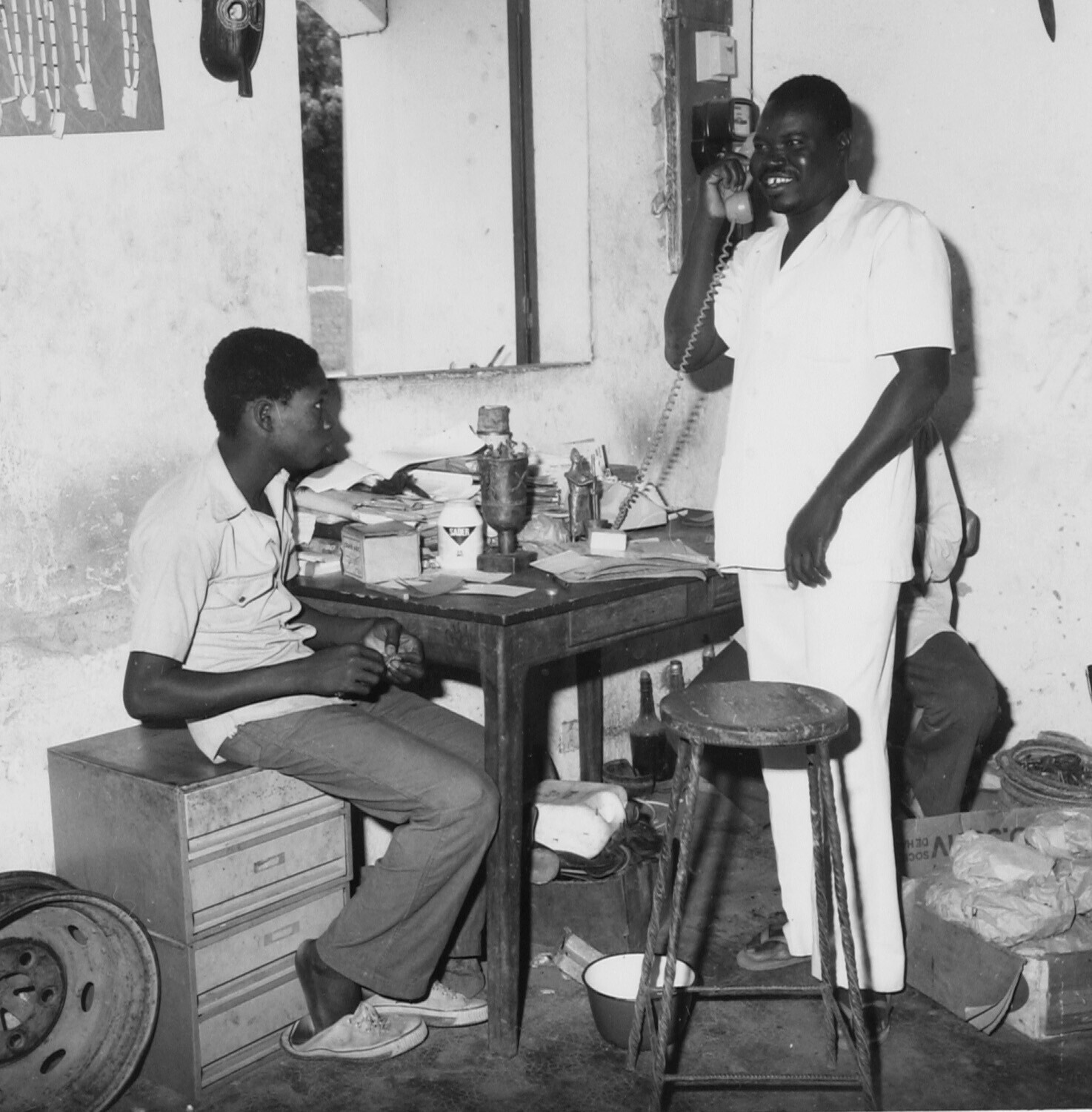 De eigenaar en kunstenaar aan de telefoon in het kan...