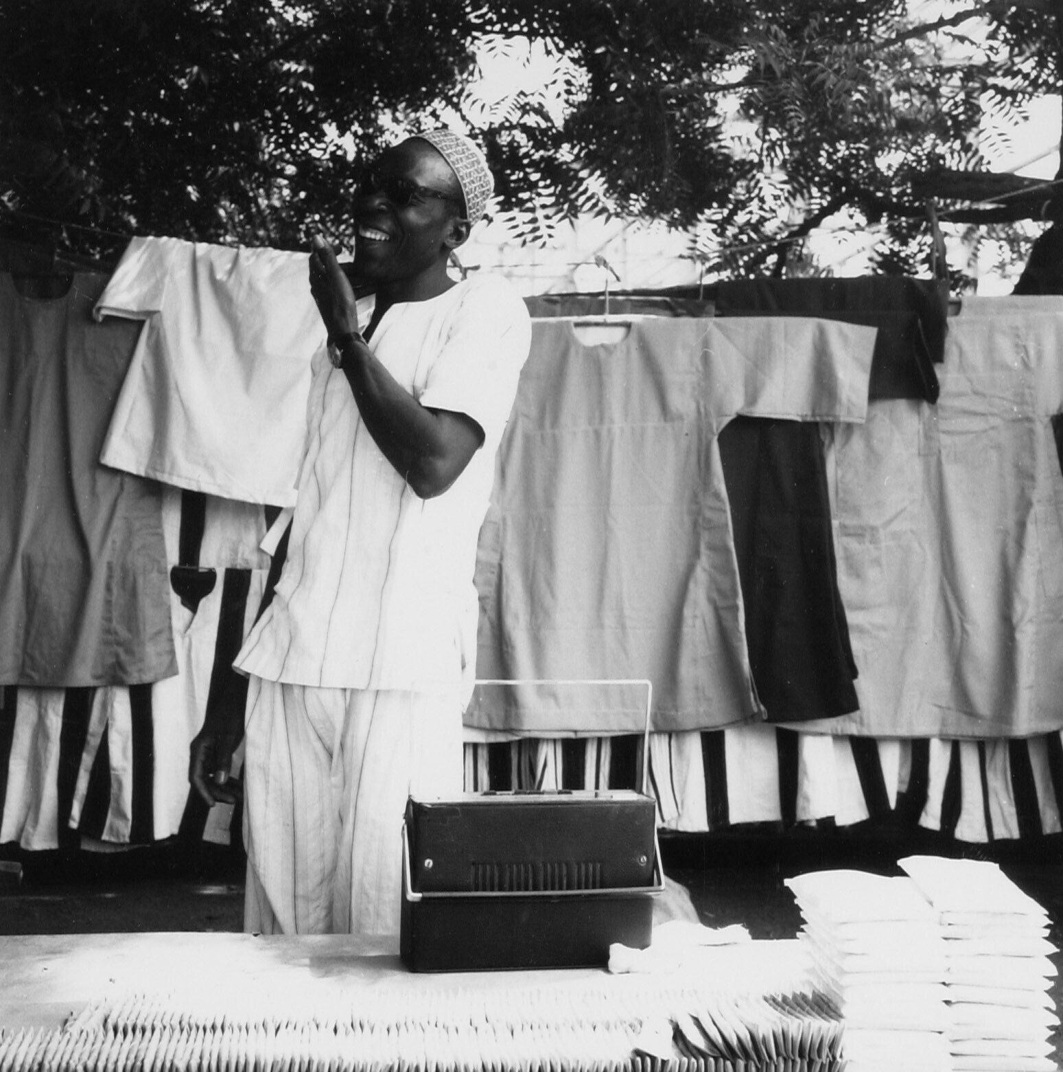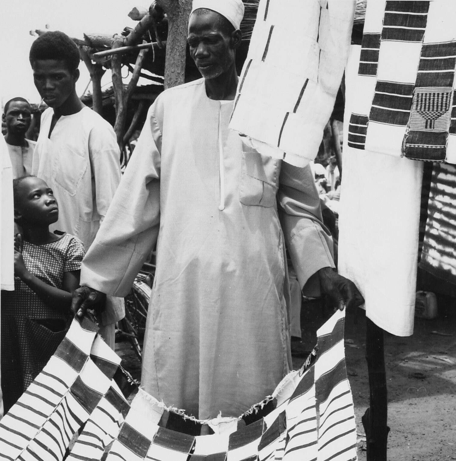 Een Mossi marktkoopman toont de doeken die hij verkoopt