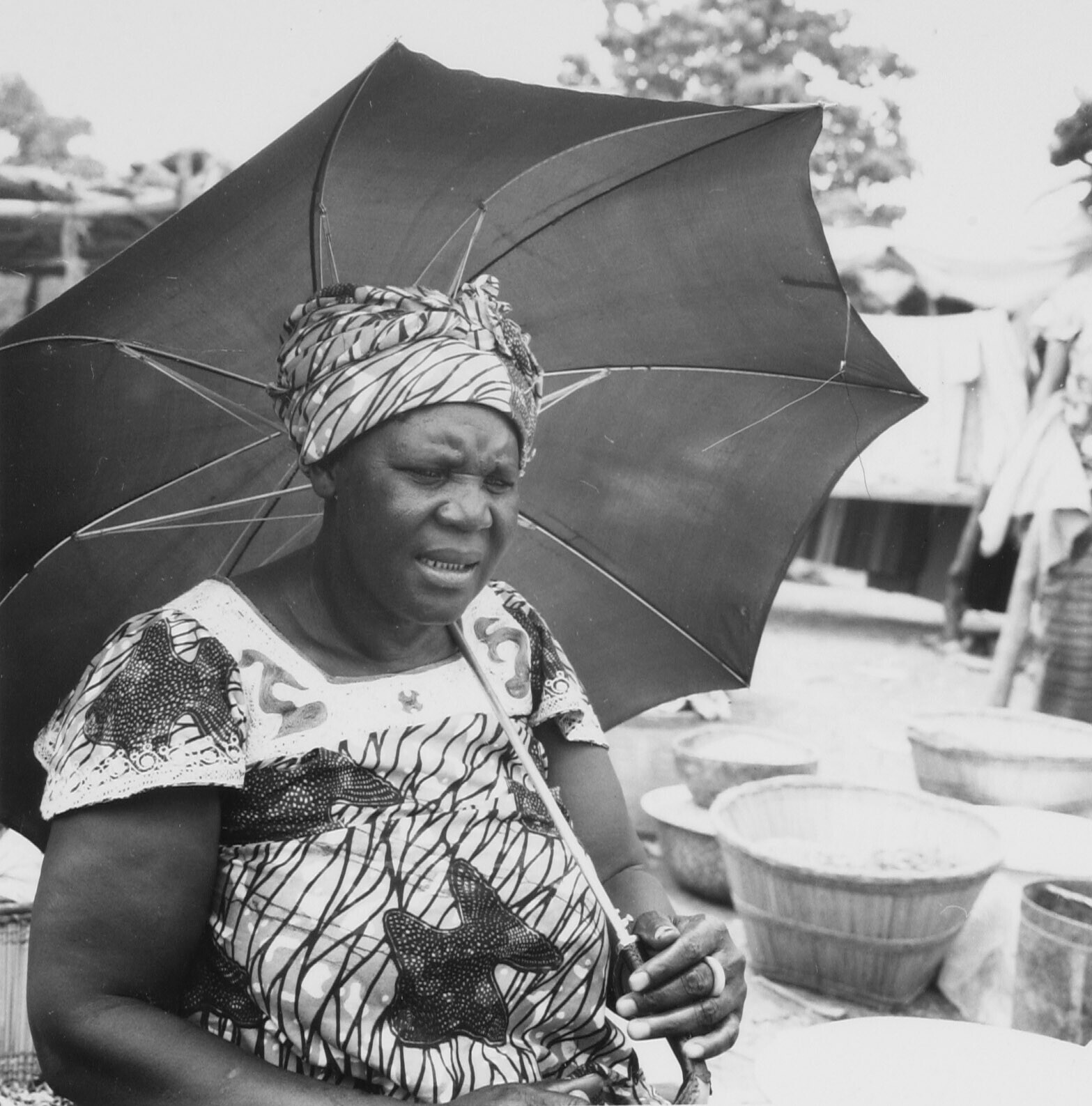 Op de markt, verkoopster met parasol