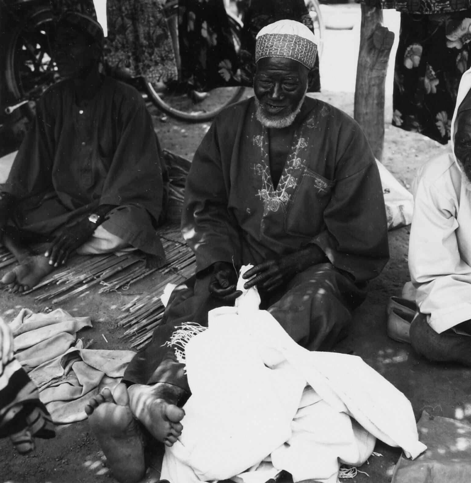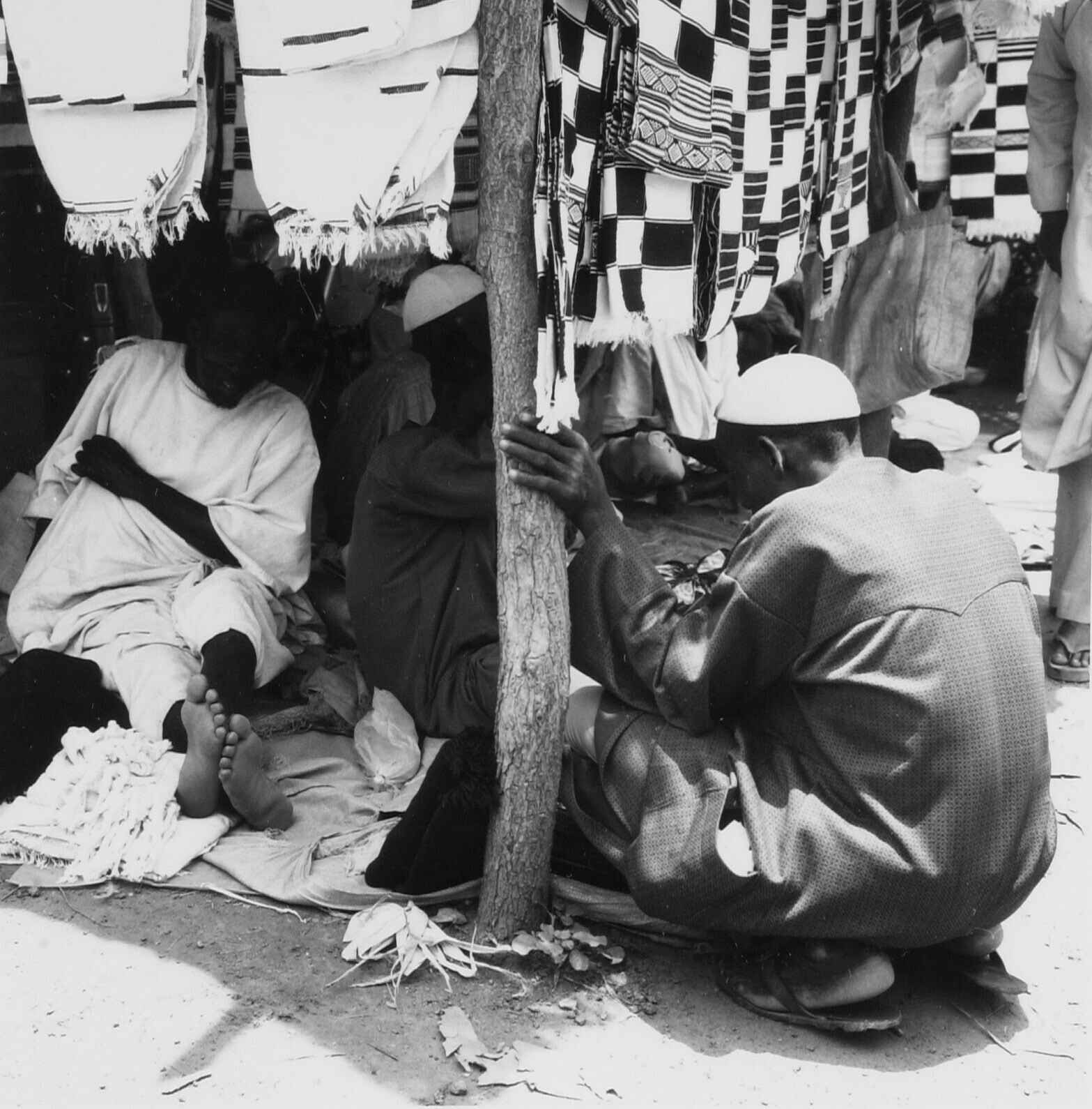 Textielverkoop op de markt te Kaya. De kleden worden...