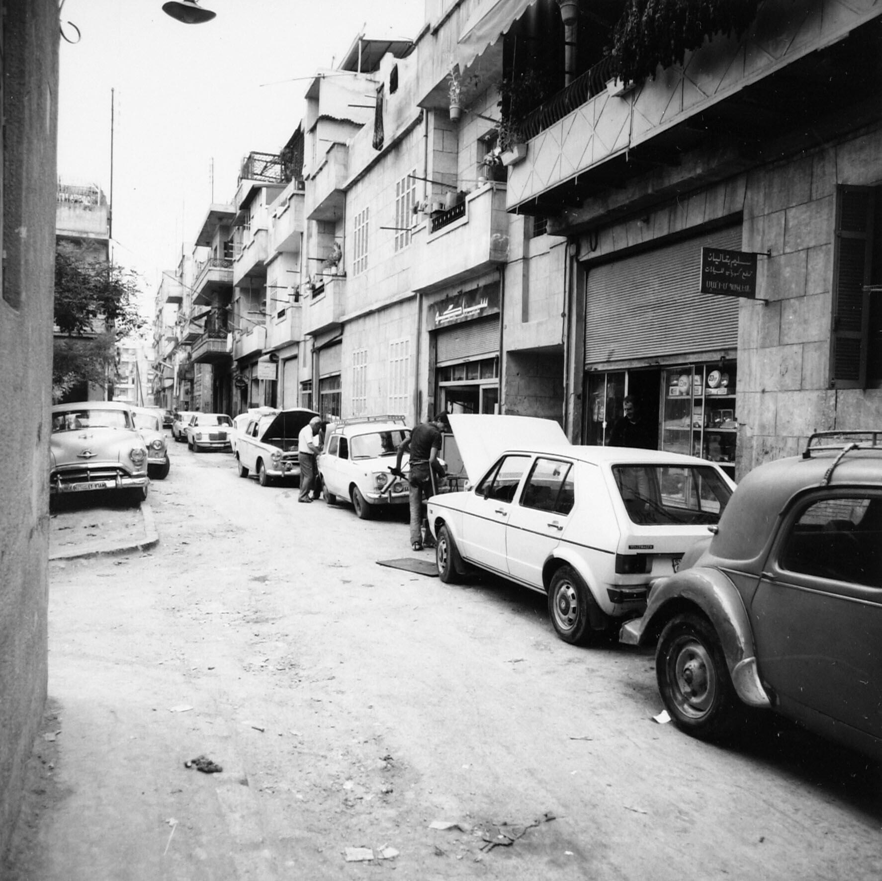 Straatgezicht met auto's die gerepareerd worden