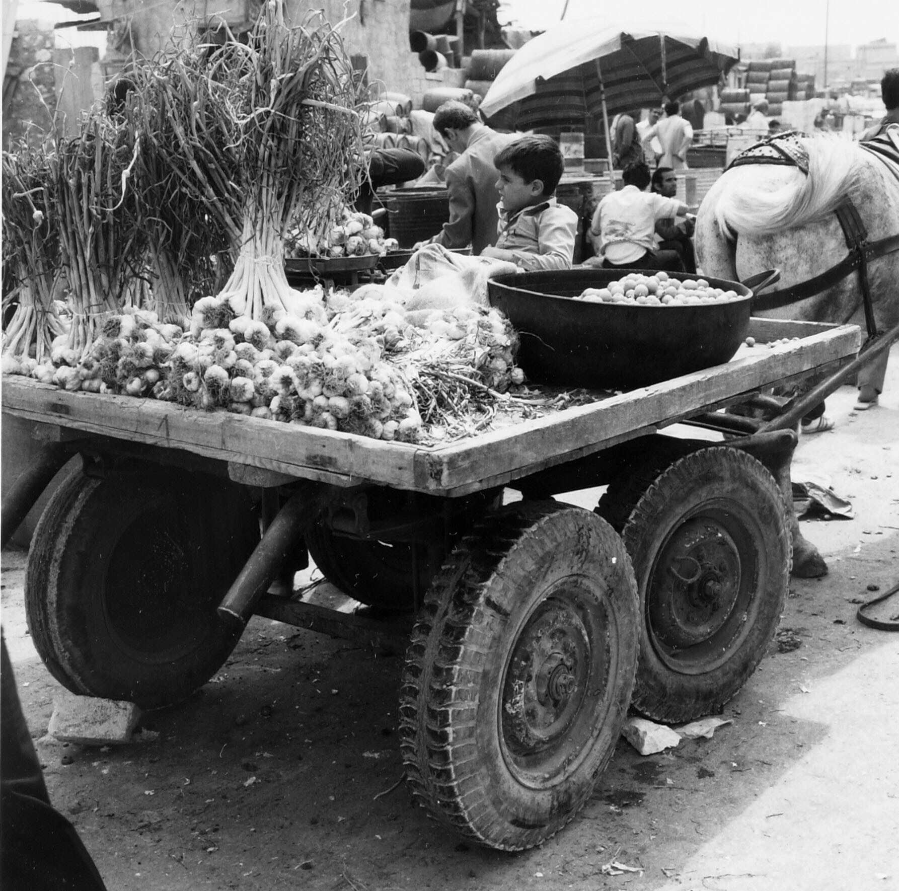 Een jongen bij zijn ingespannen ezel te Kaya