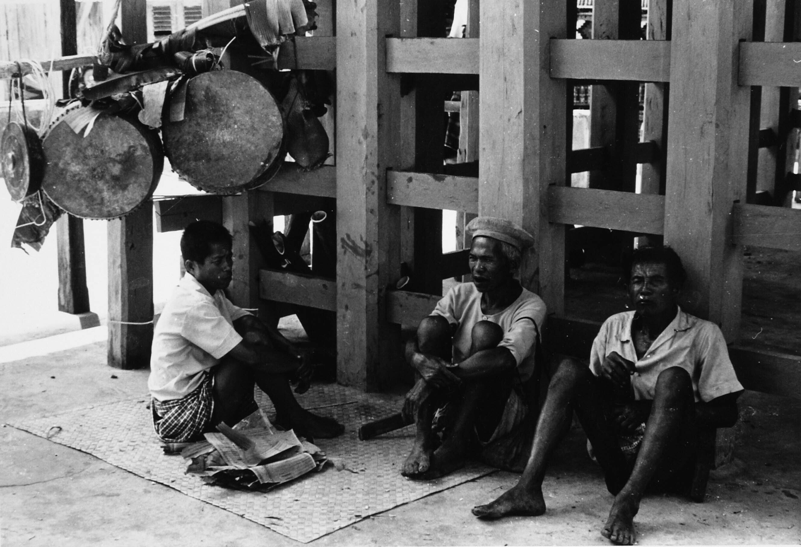 Mannen bij de trommen en de gong waarop geslagen wor...