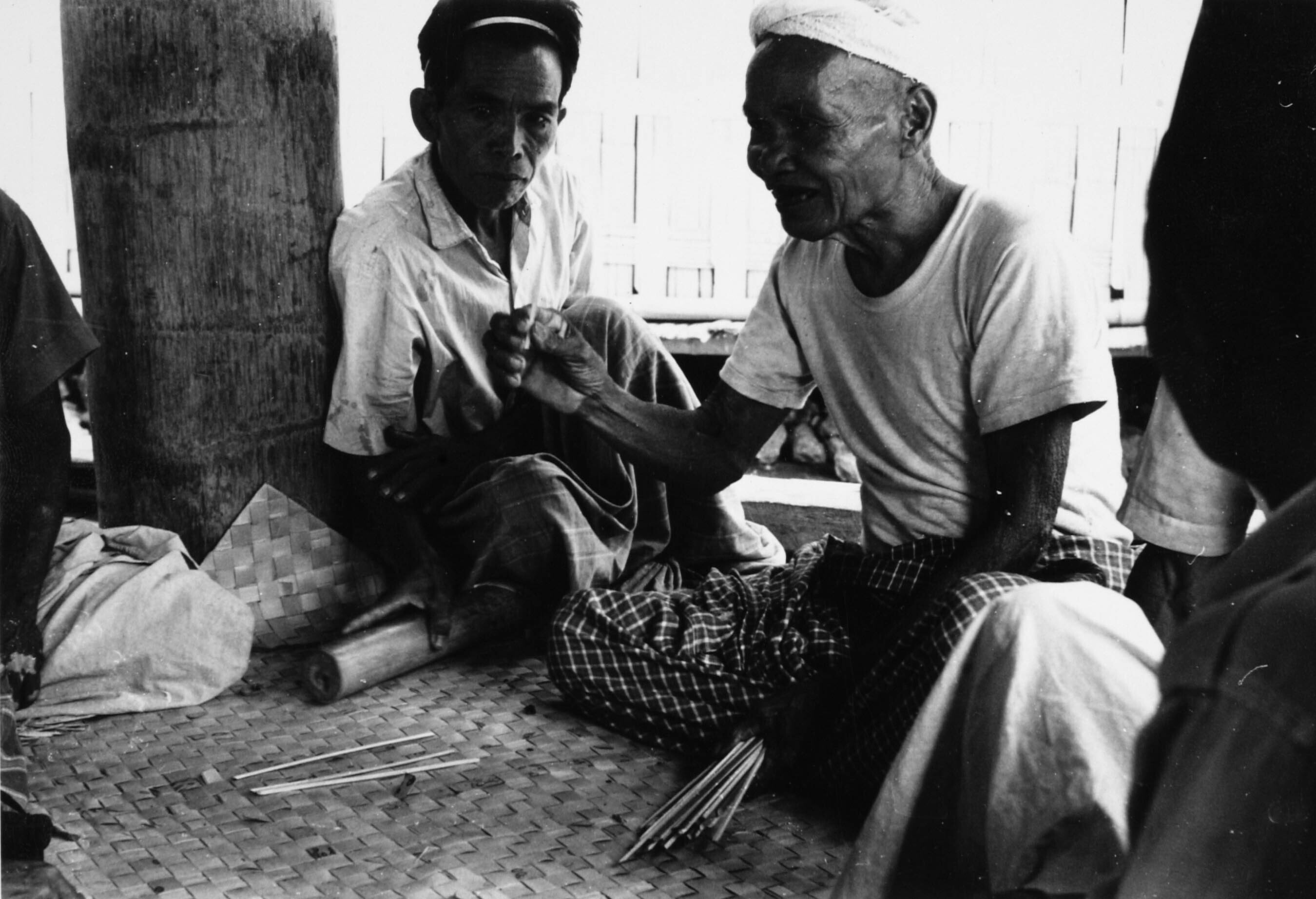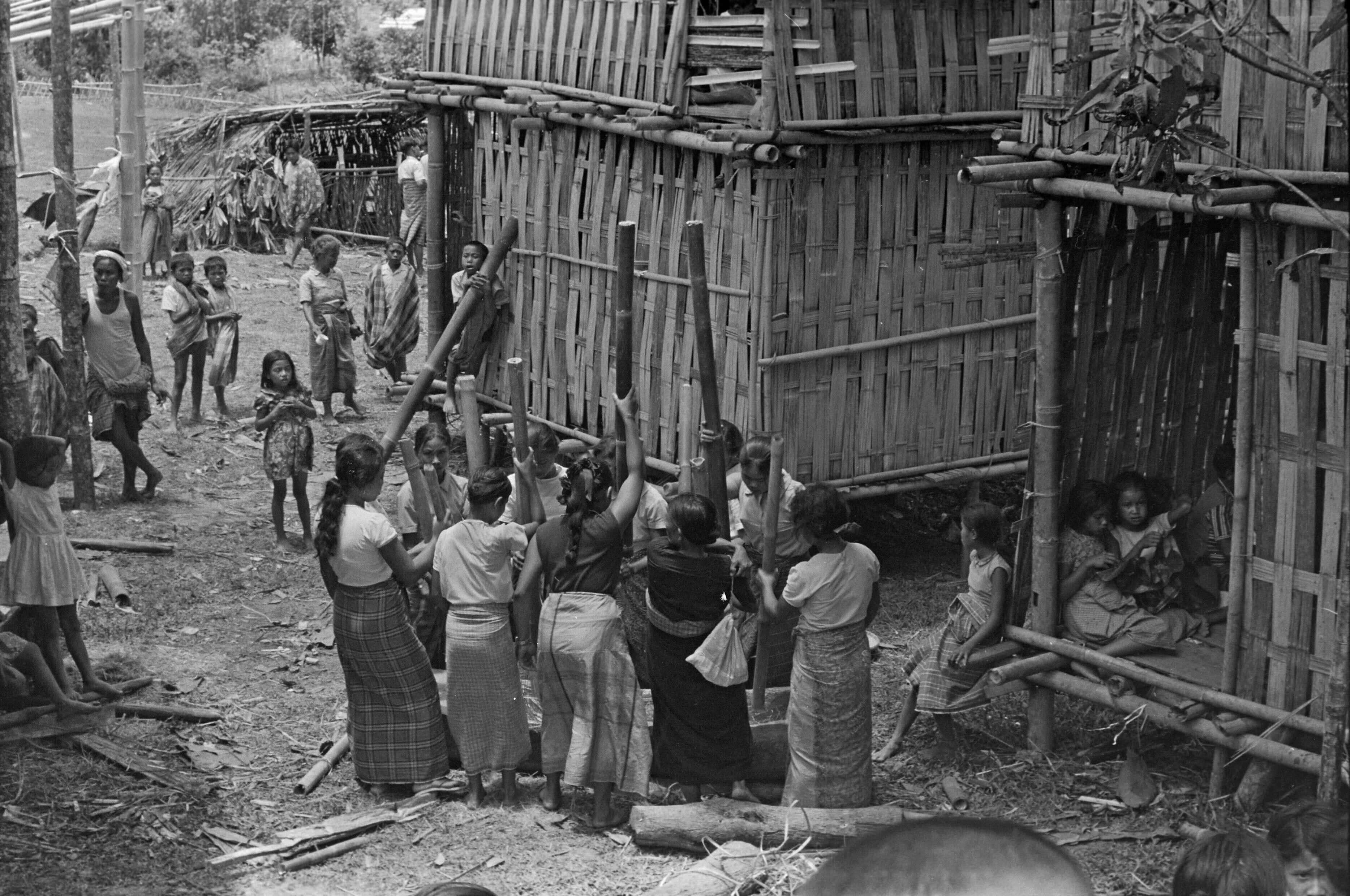 Het ritueel rijststampen tijdens het eerste gedeelte...