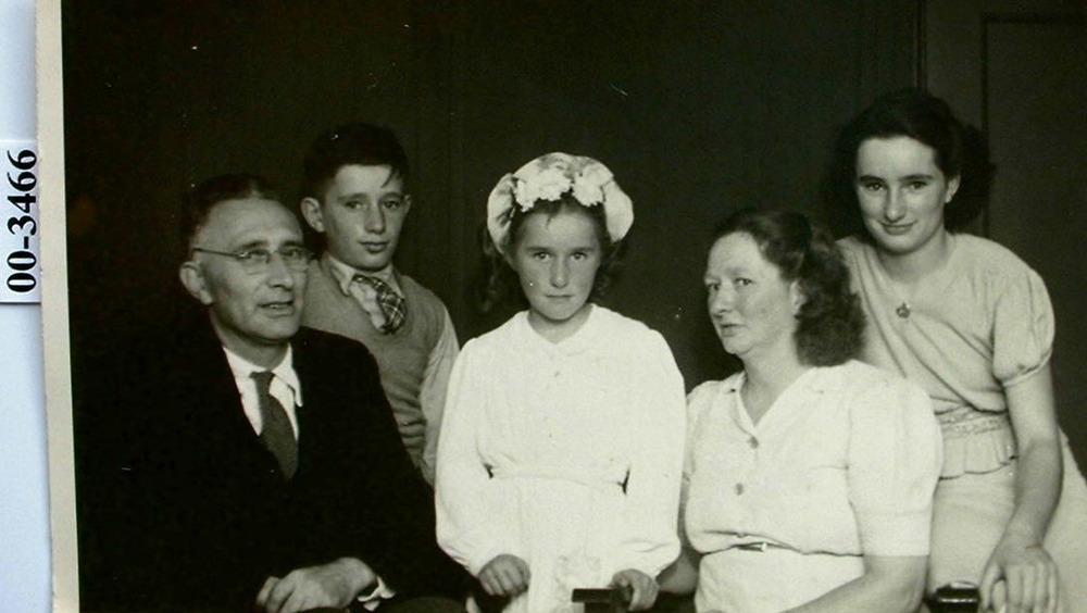 Zwart-wit foto van de familie Grob in een visserboot...