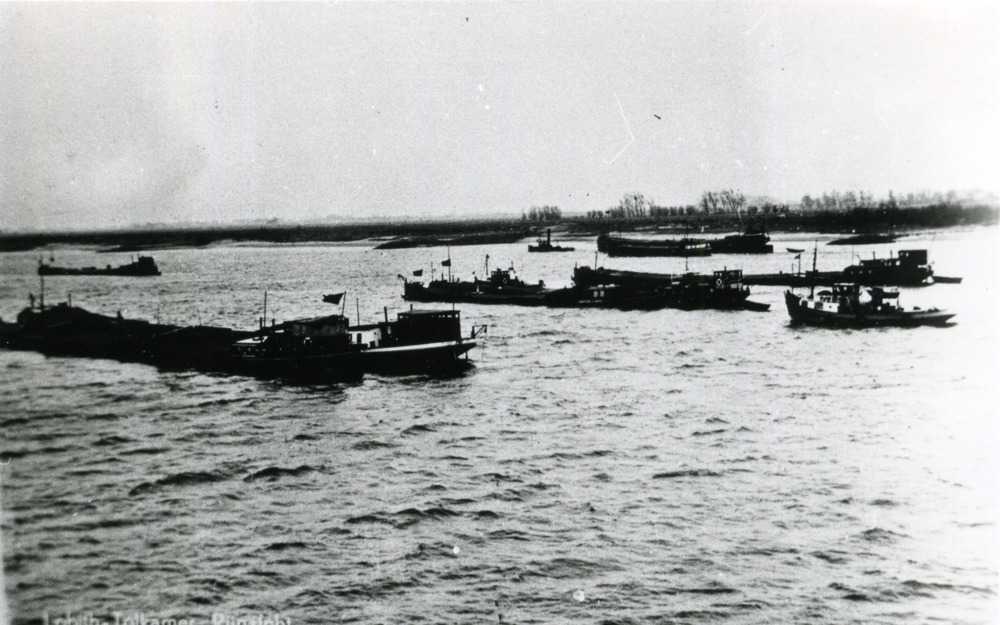 Zwart-wit foto van een aantal boten op de Rijn bij T...