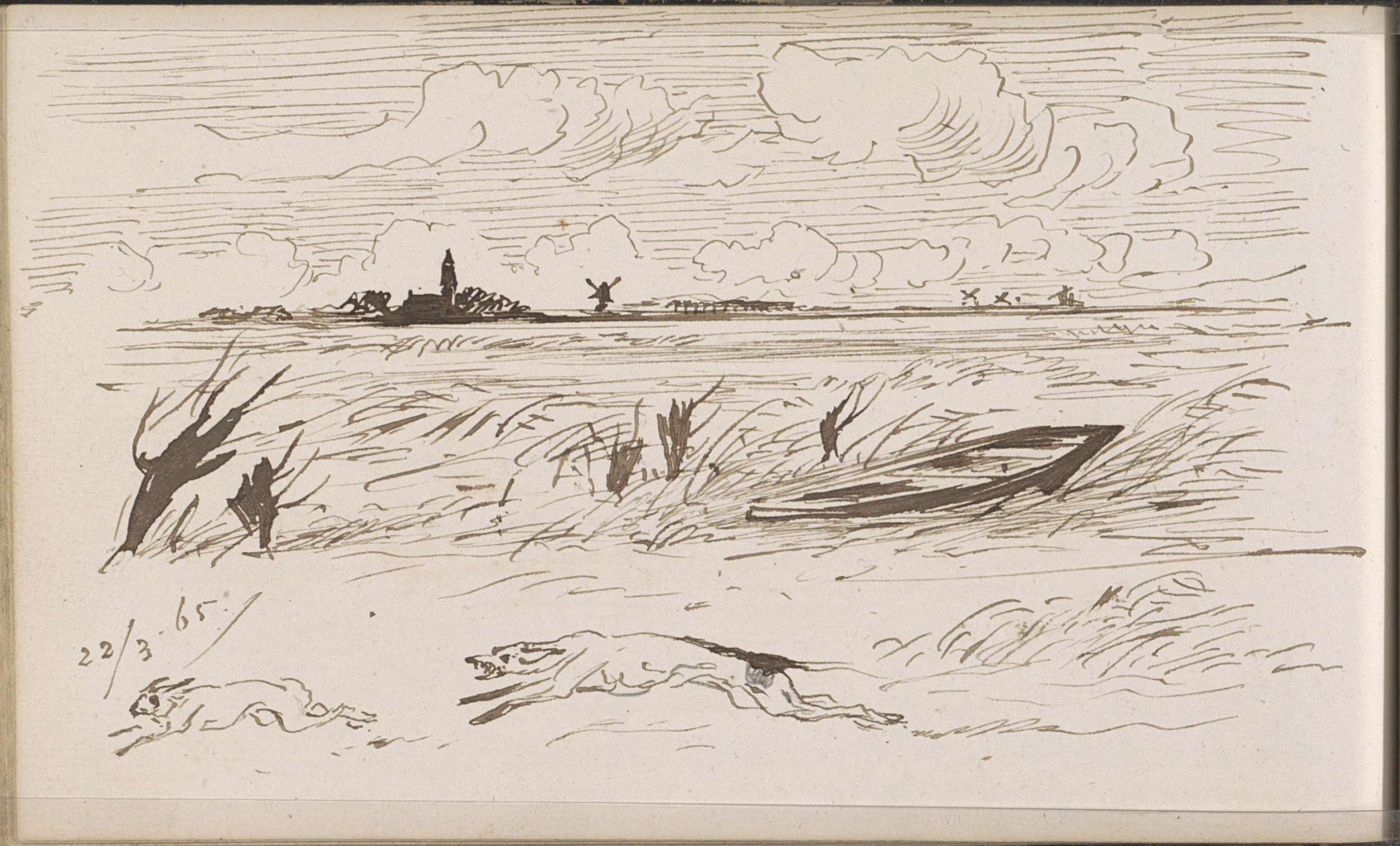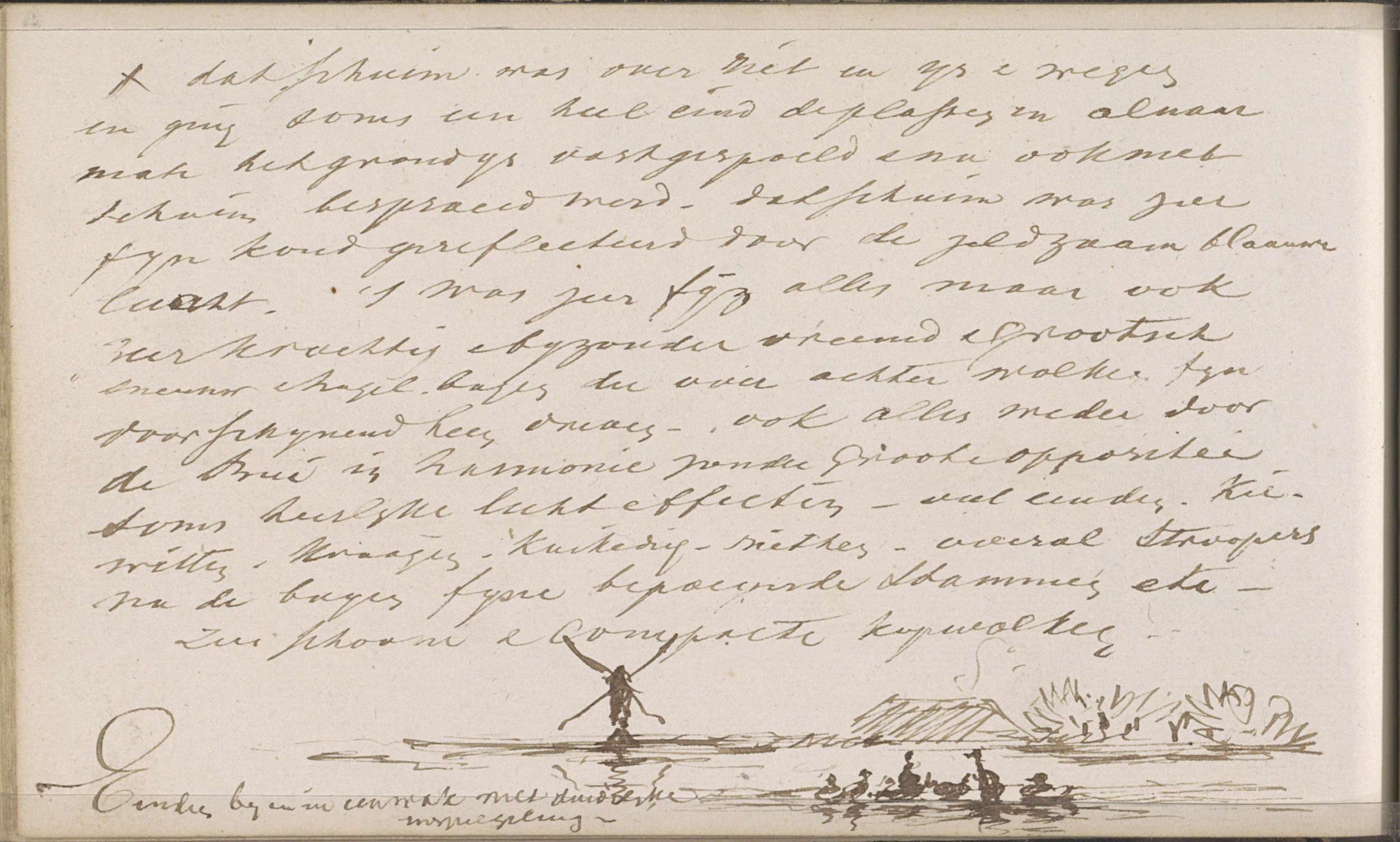Landschap met figuren die een roeiboot de waterkant ...