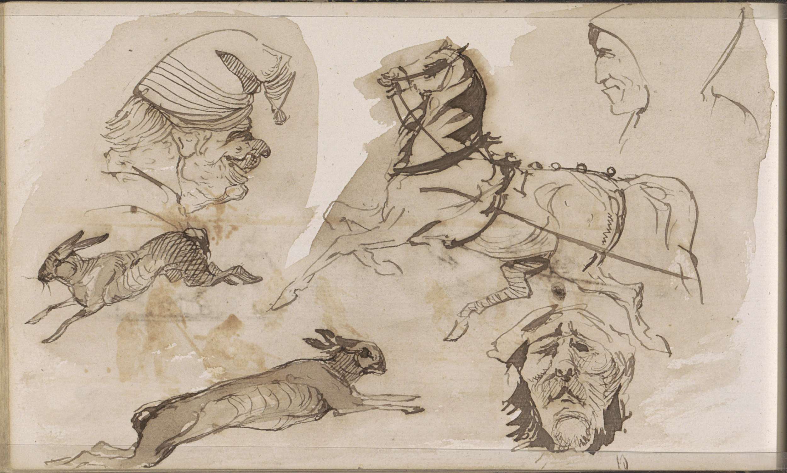 Hazen, een paard in galop en mannenkoppen