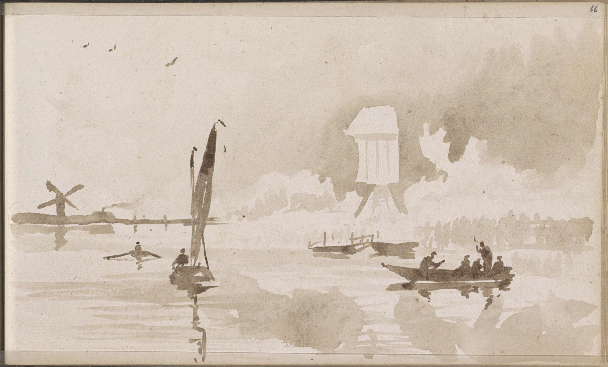 Rivierlandschap met molens en figuren in roeiboten