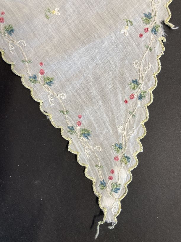 Batisten tipdoek met verbleekt gekleurd tamboereerwe...