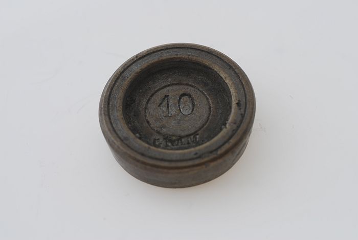 Rond gewicht met daarin de tekst "10 gram" gestanst