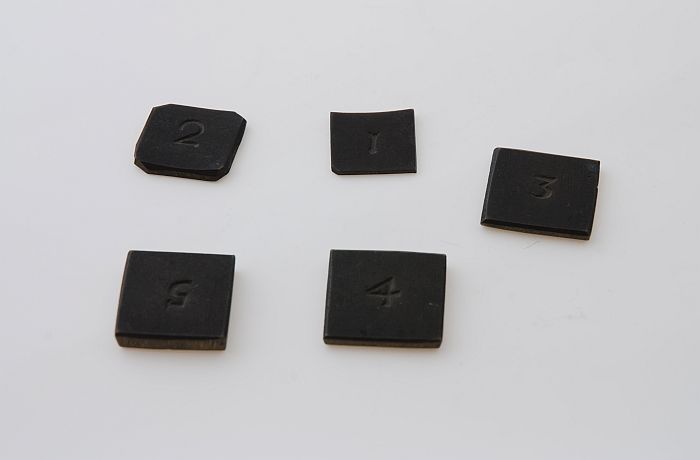 Vijf vierkante gewichten behorend bij korenschaalbal...