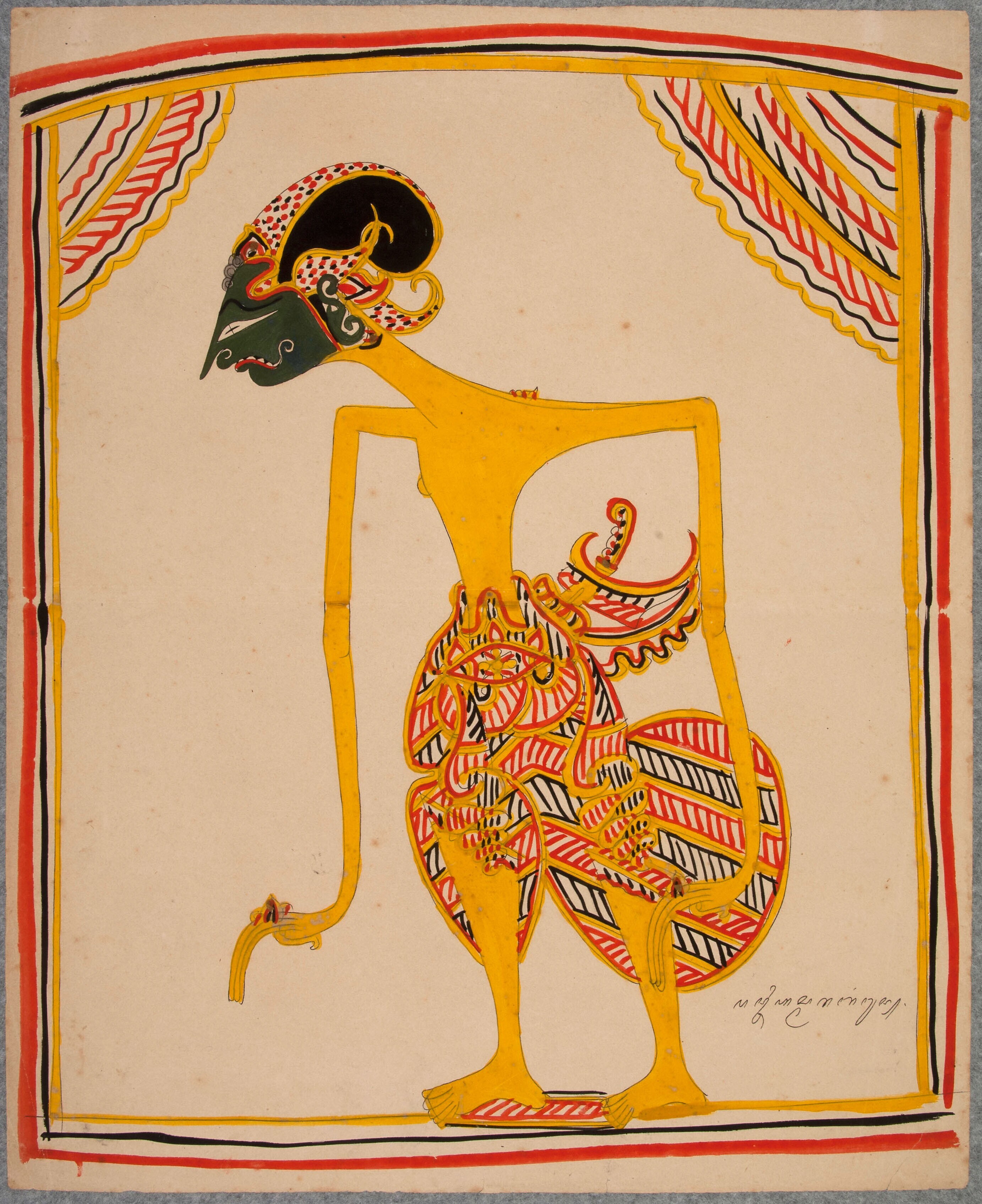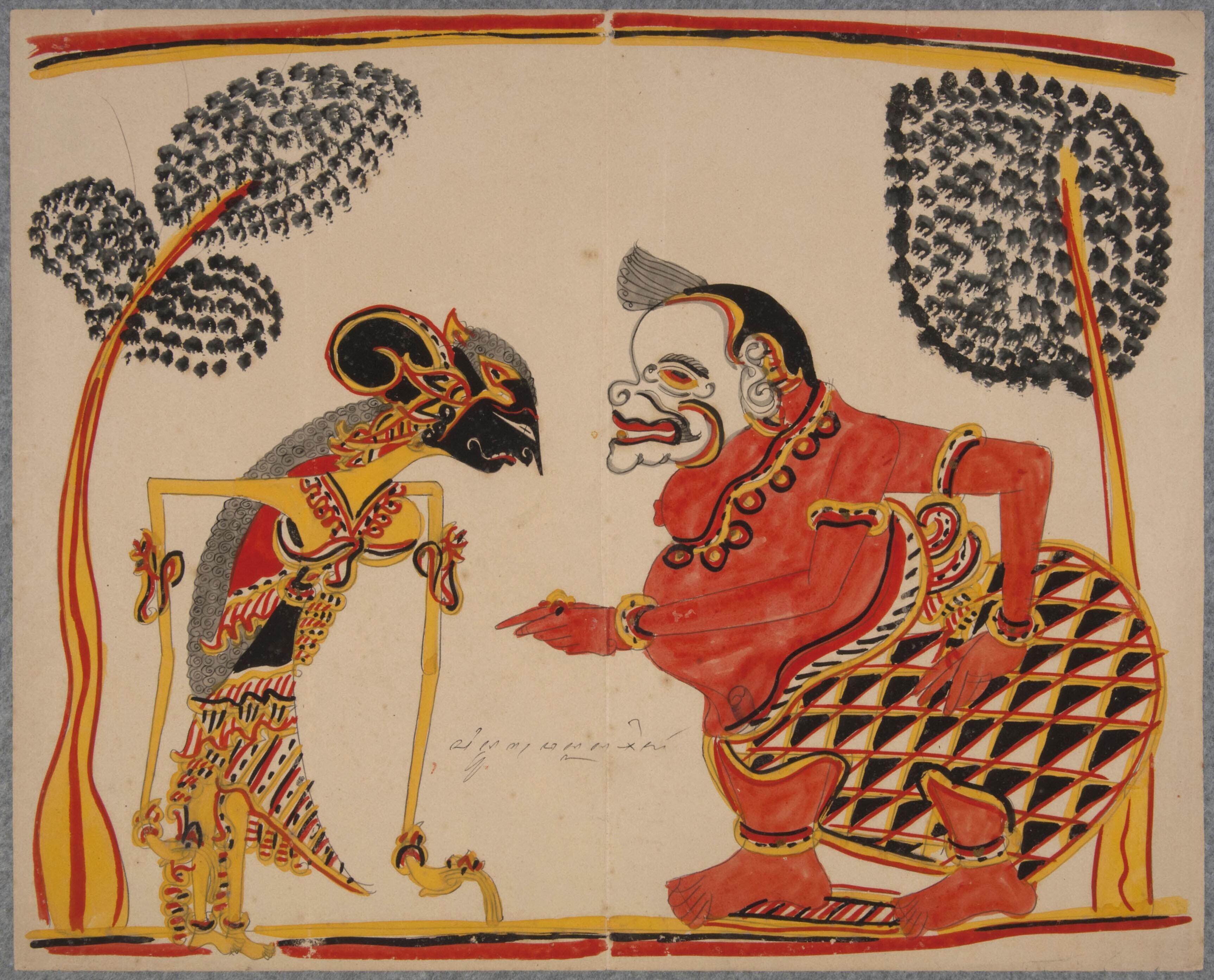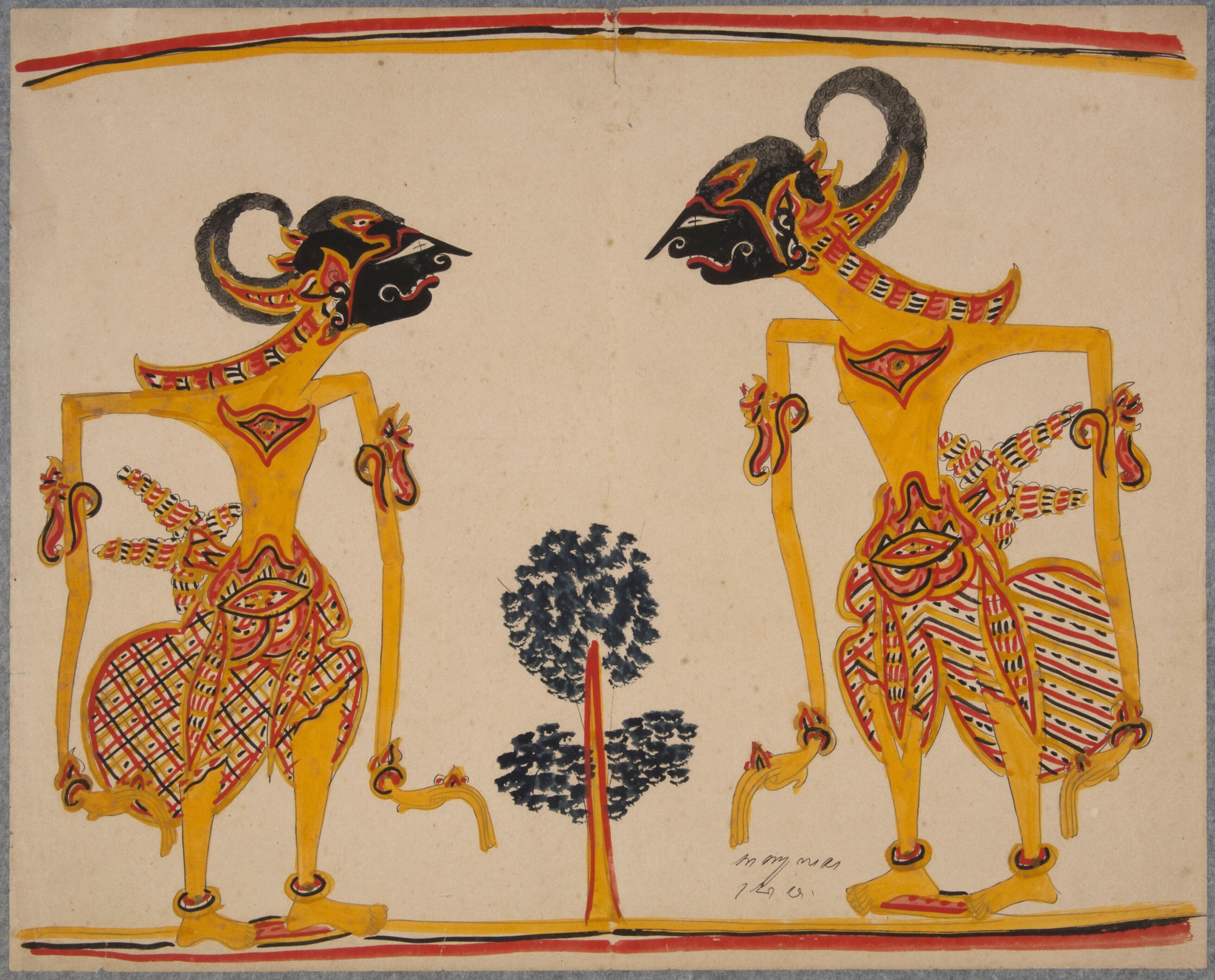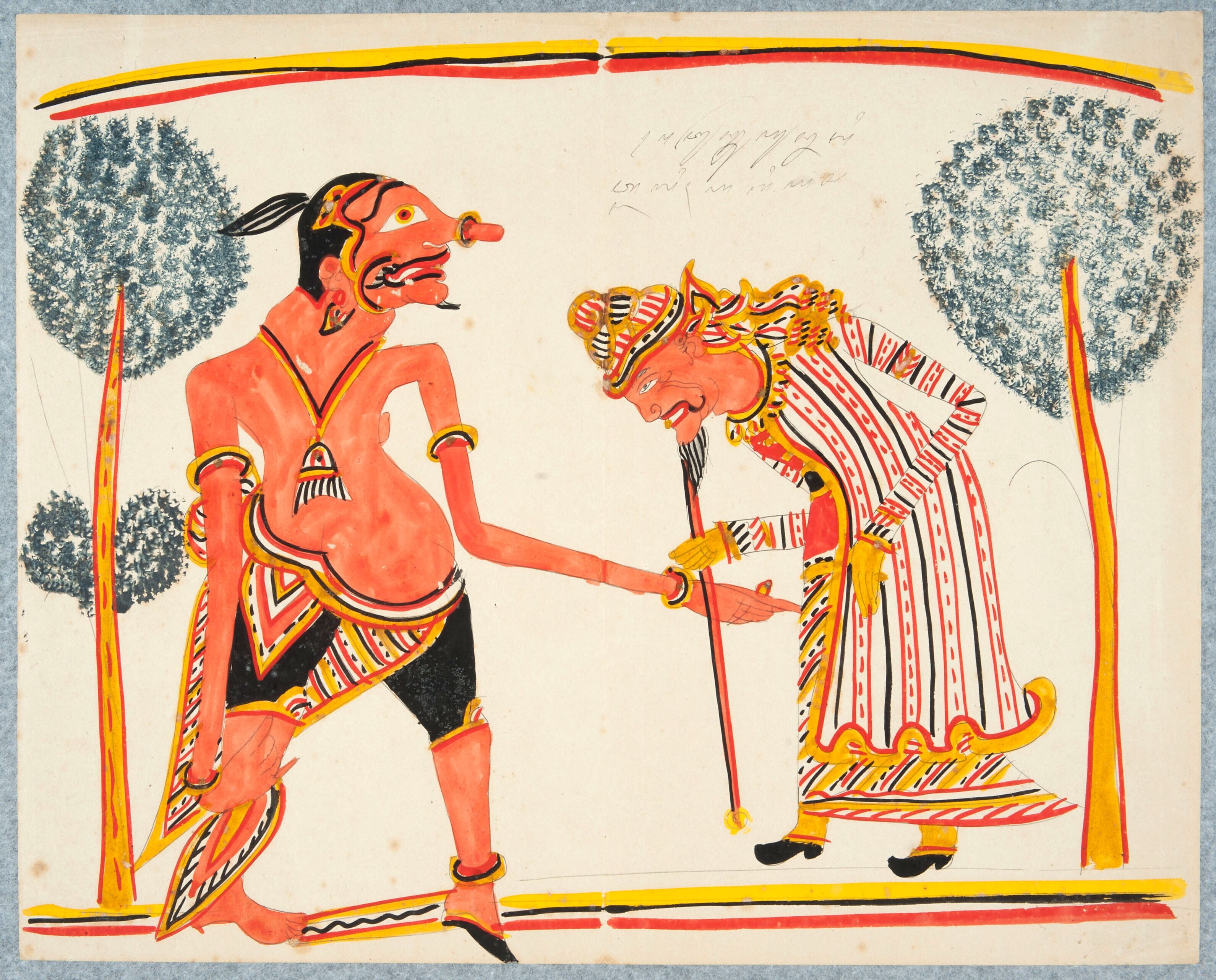 Twee wajangfiguren voorstellende Petruk die afscheid...