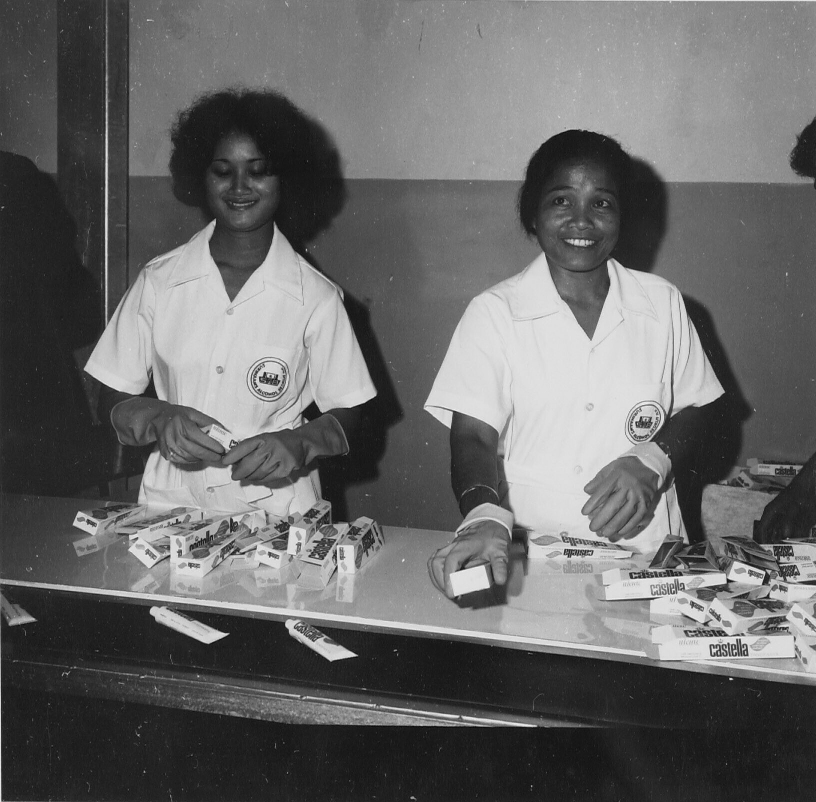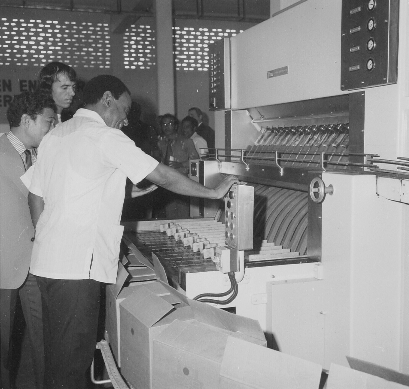 S.A.B. Verpakking van de gevulde flessen aan de lope...