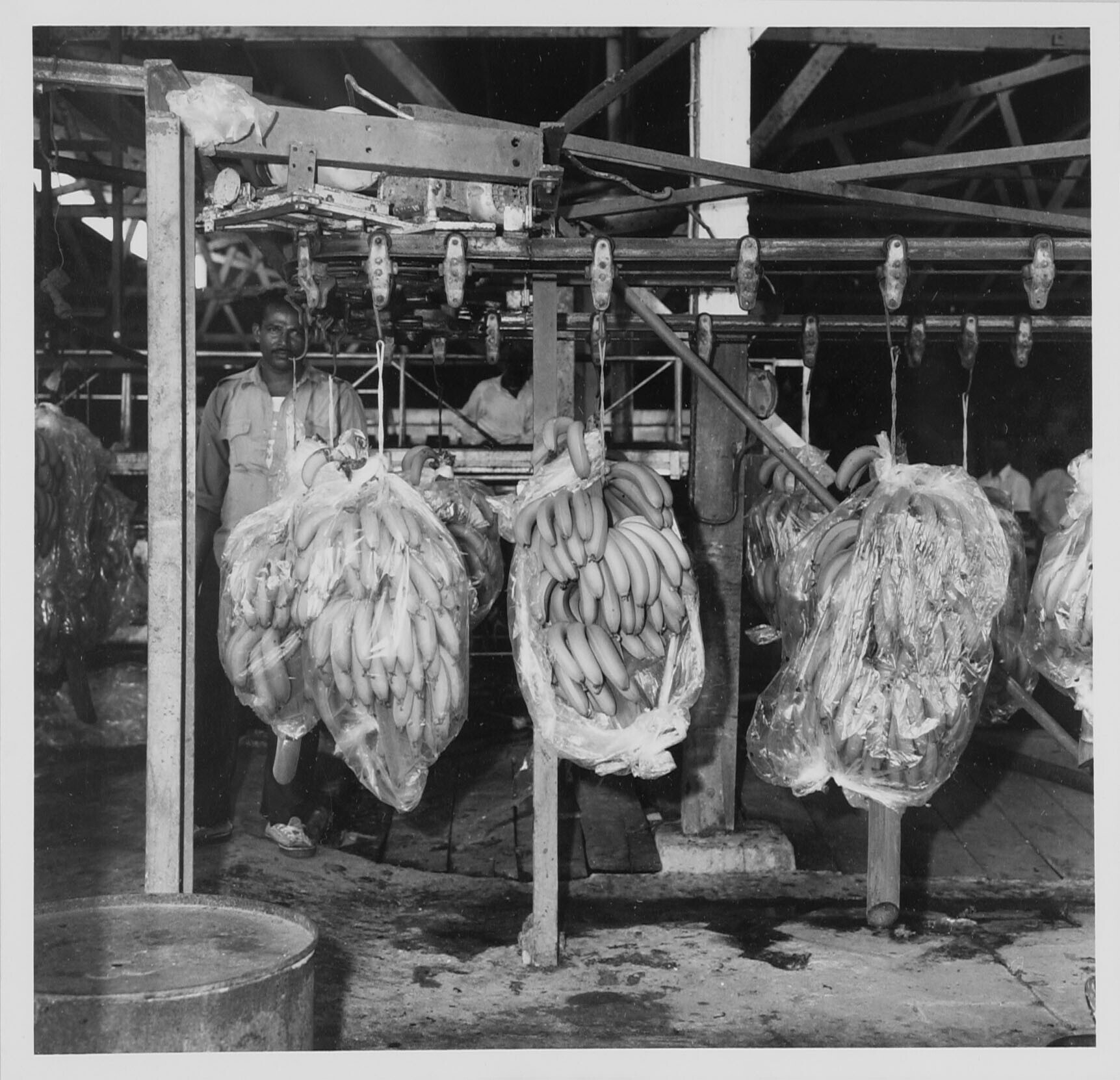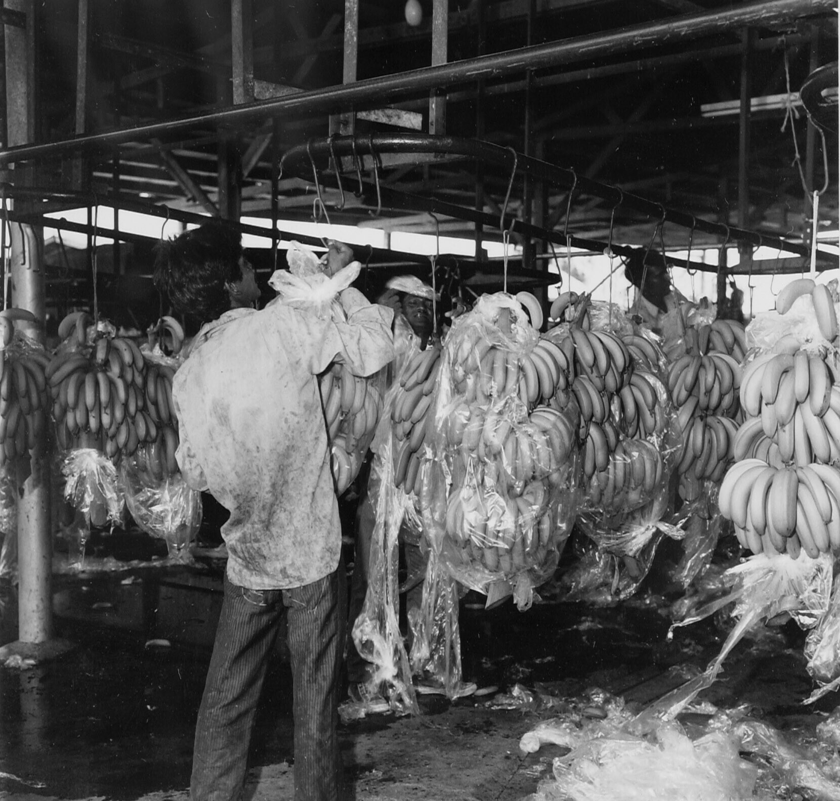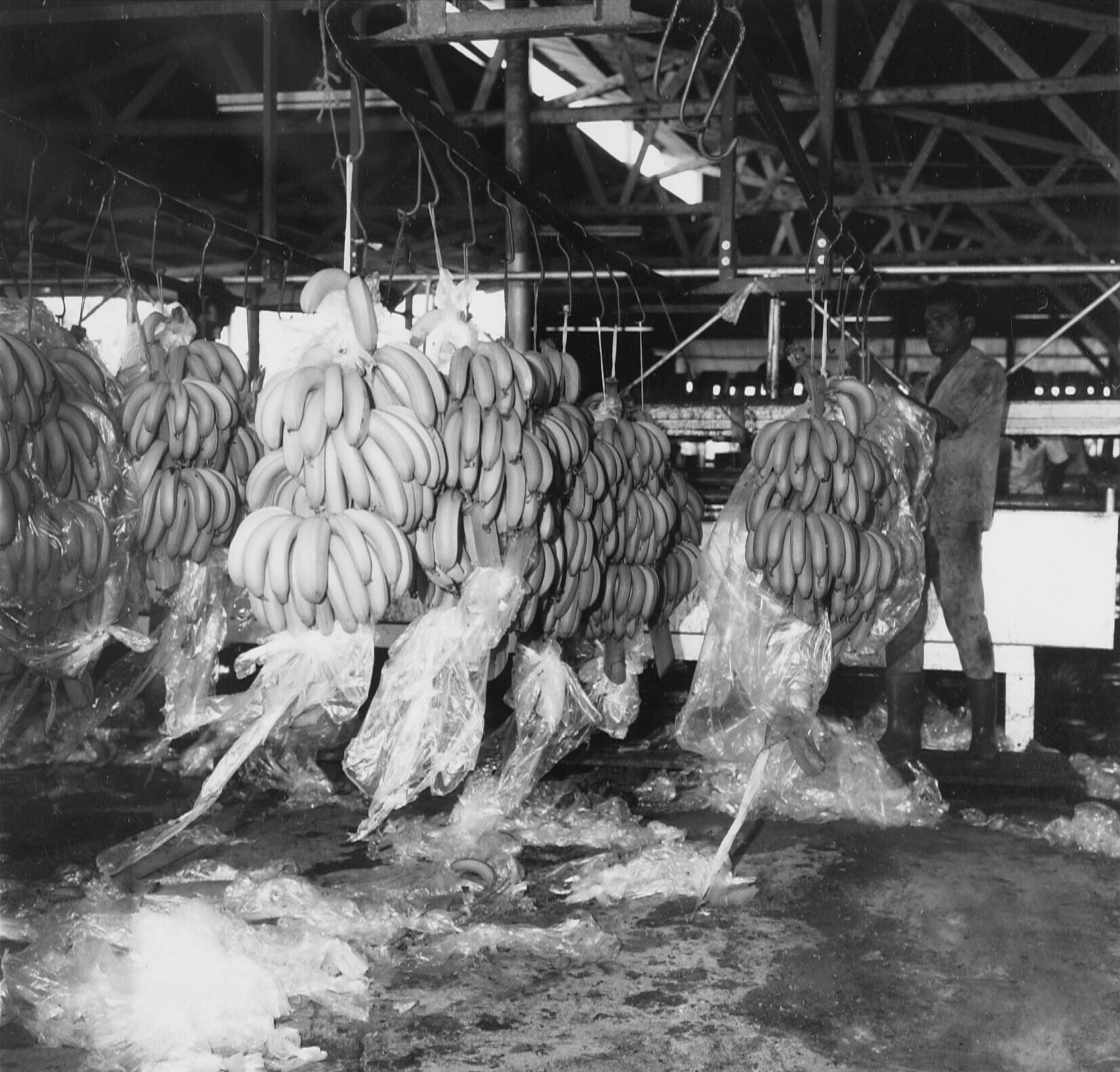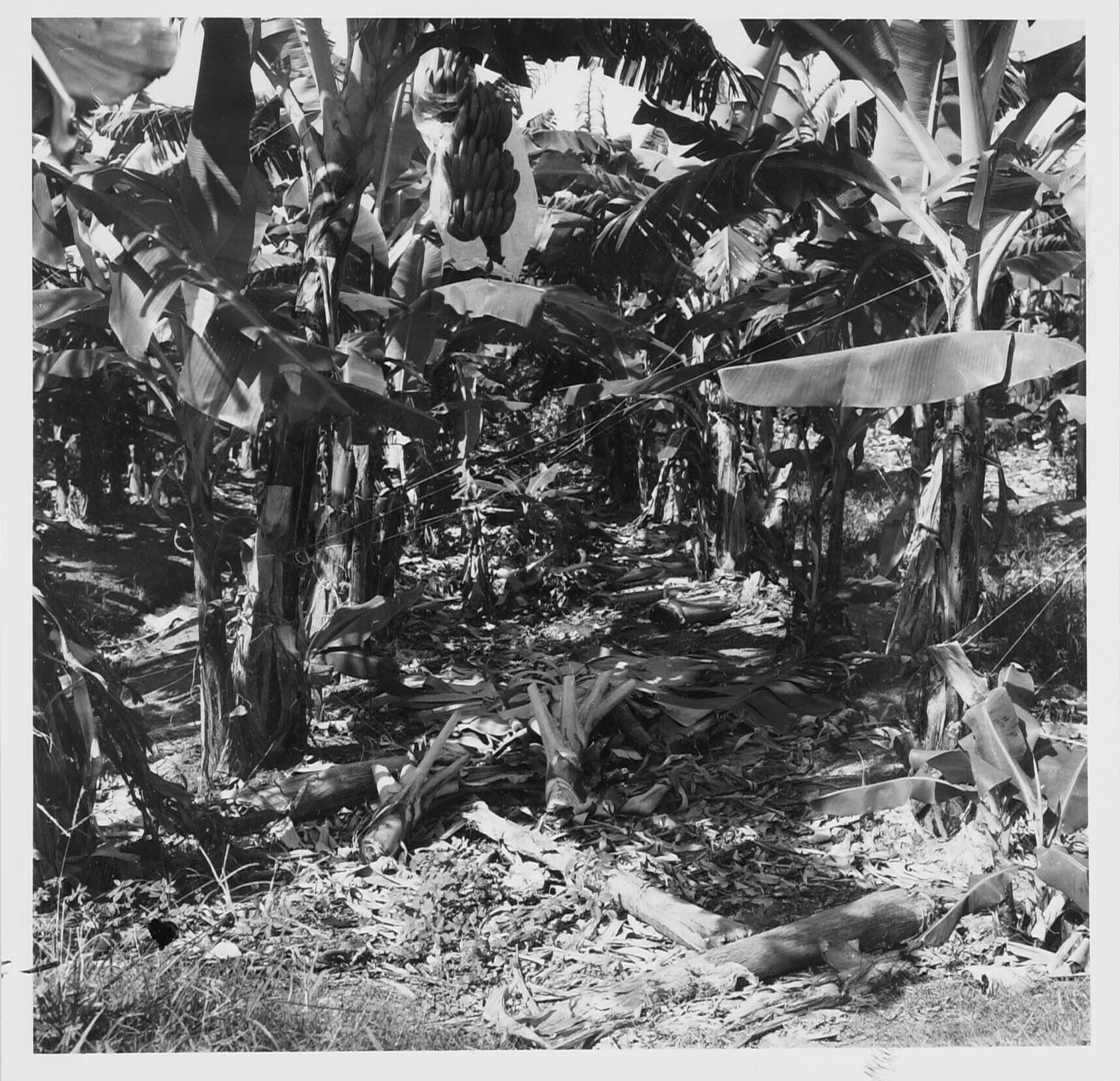 Bakovencultuur. Aangevoerde bananentrossen v/d werkhal
