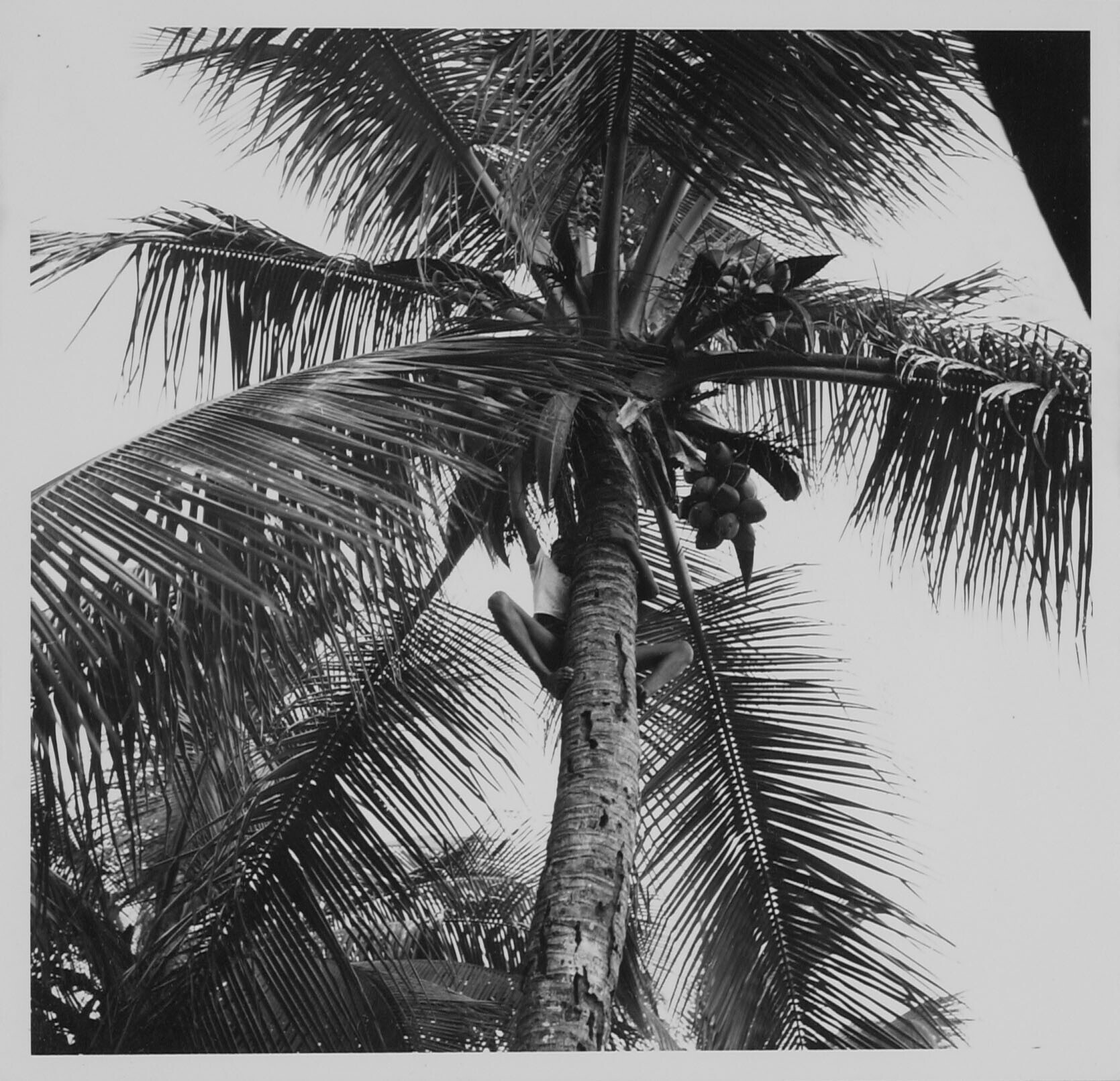 Hindoestaans jongetje plukt jonge kokosnoten