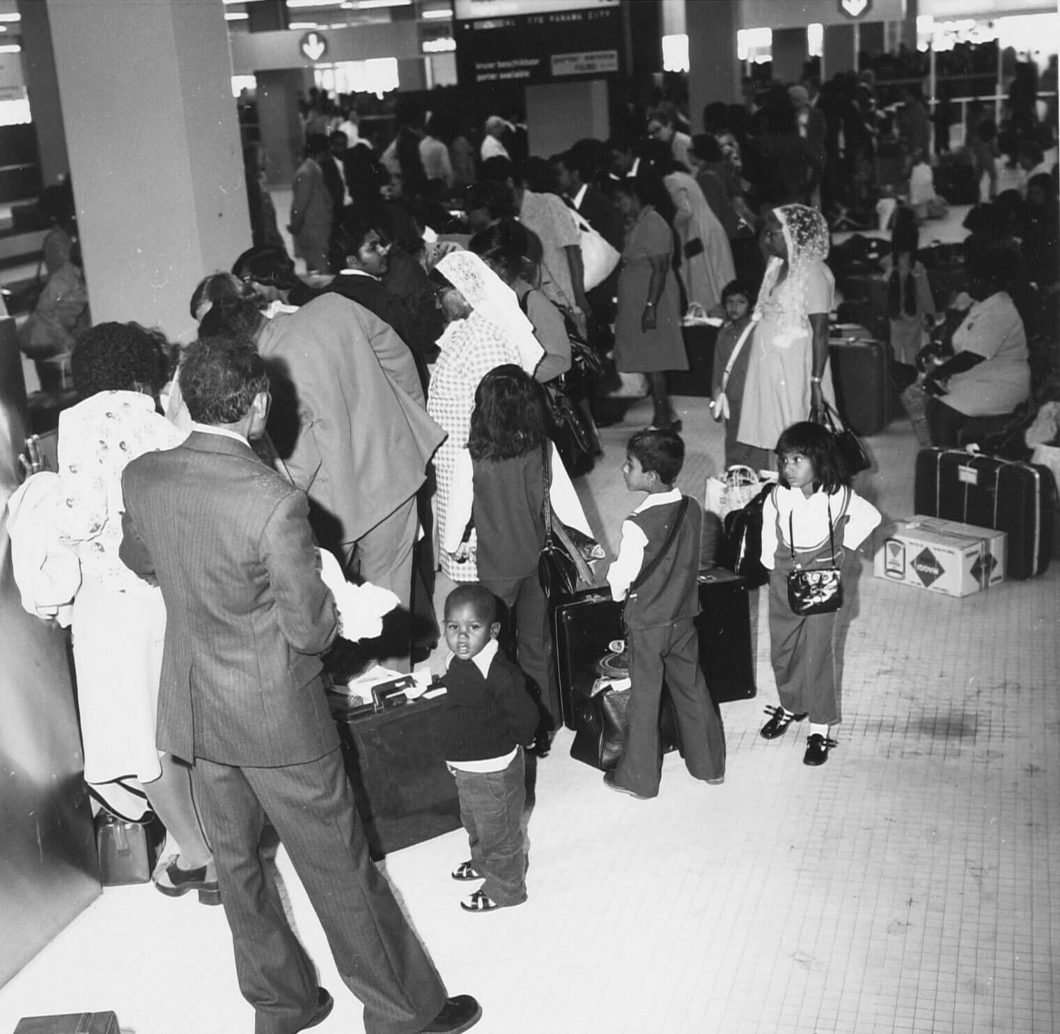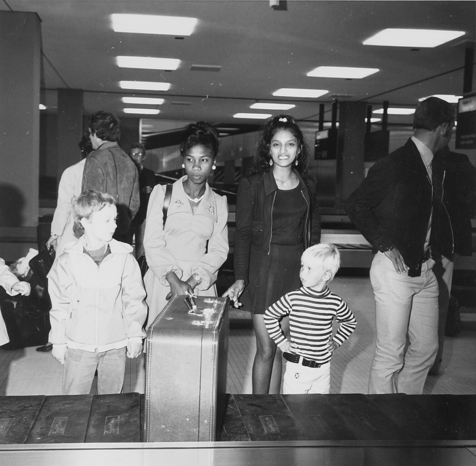 Aankomst Surinamers op Schiphol; wachtend op de bagage