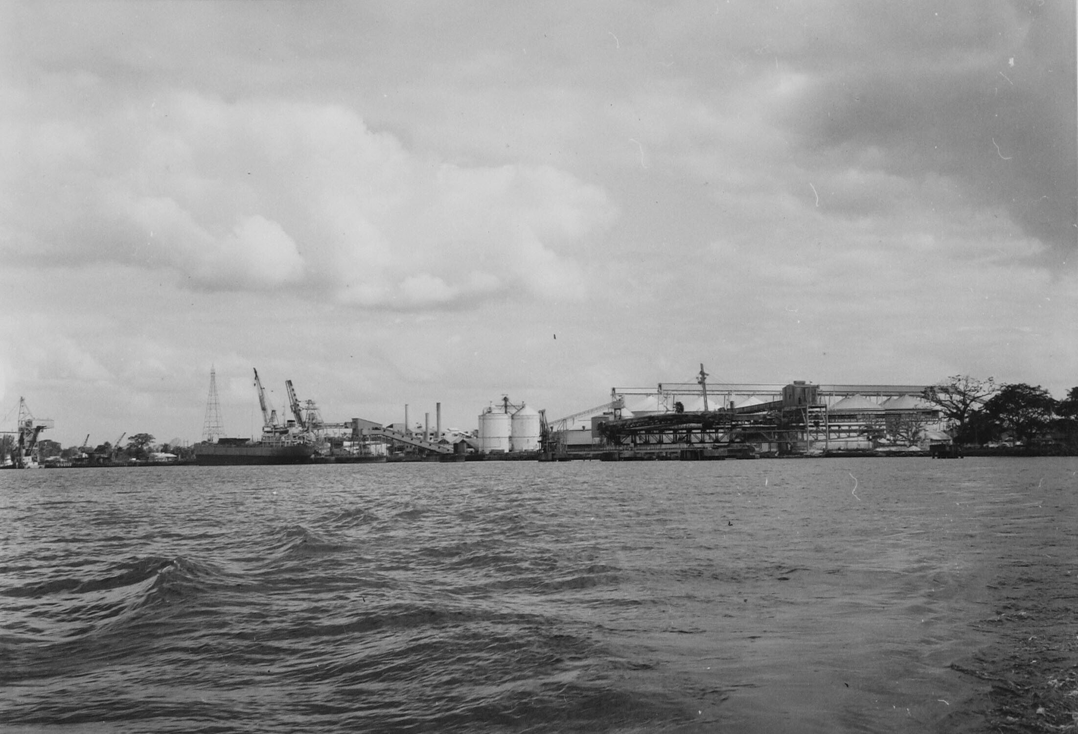 Bauxietverwerking met links een van de zware sleepboten