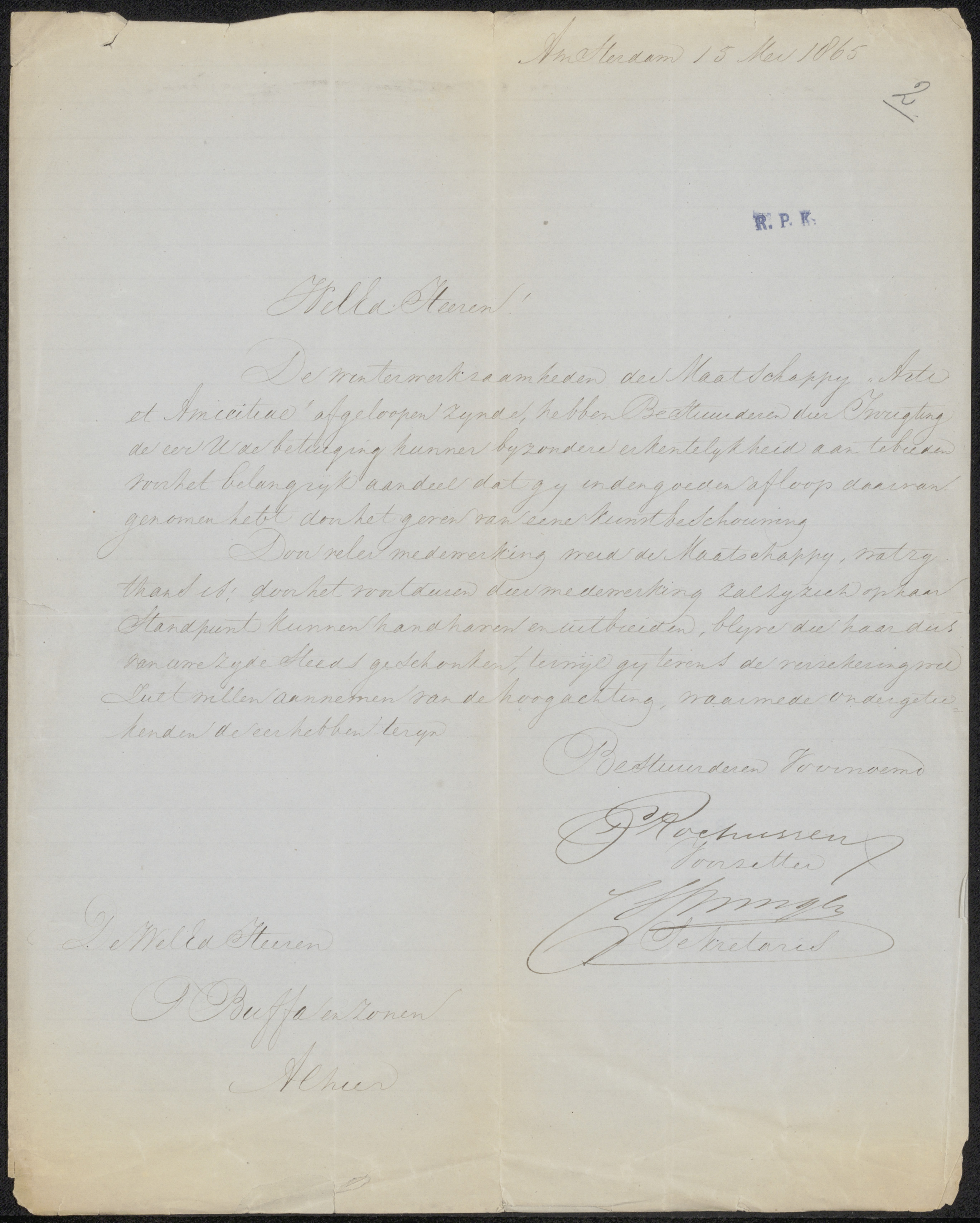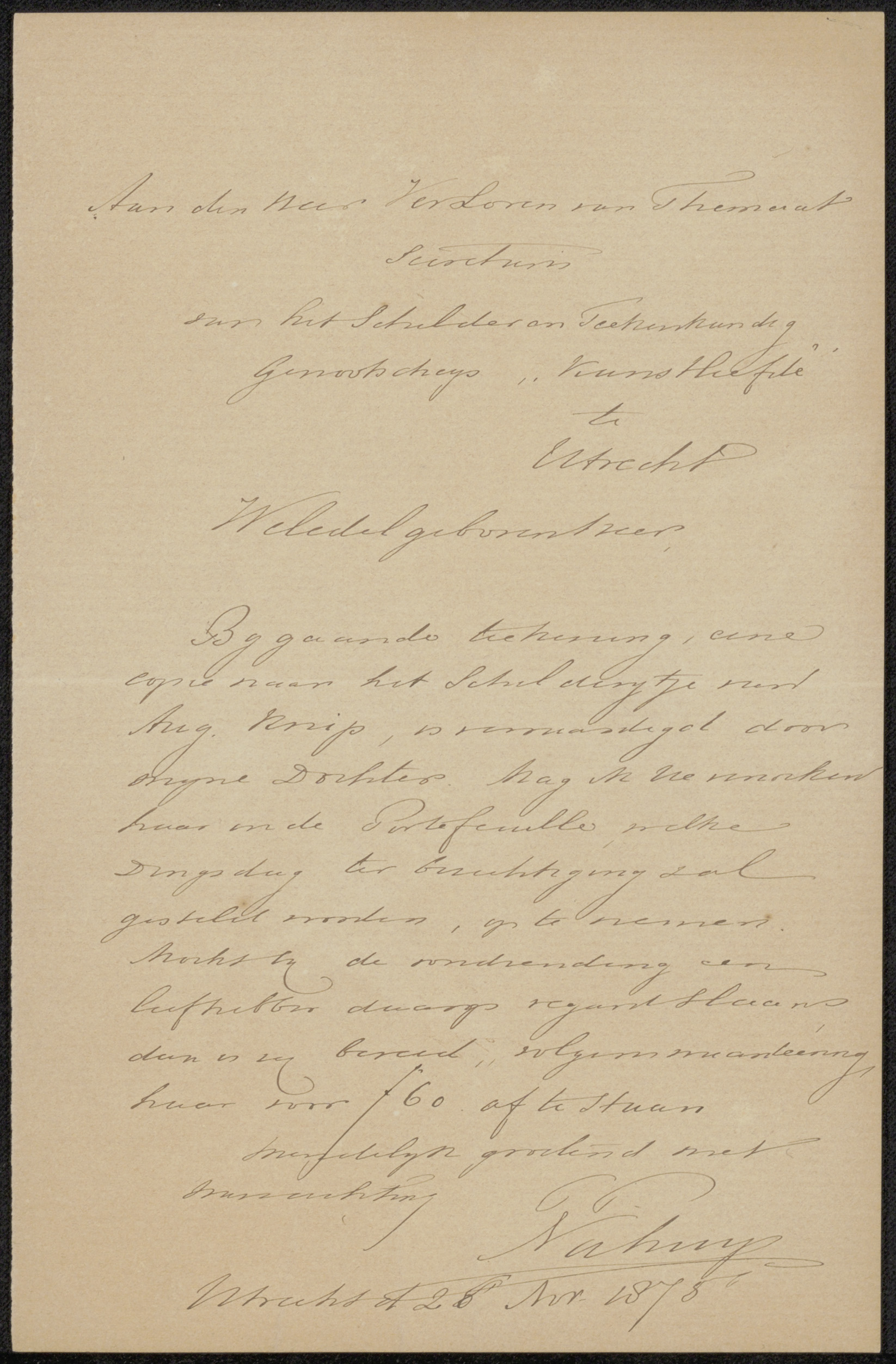 Brief aan het bestuur van Genootschap Kunstliefde