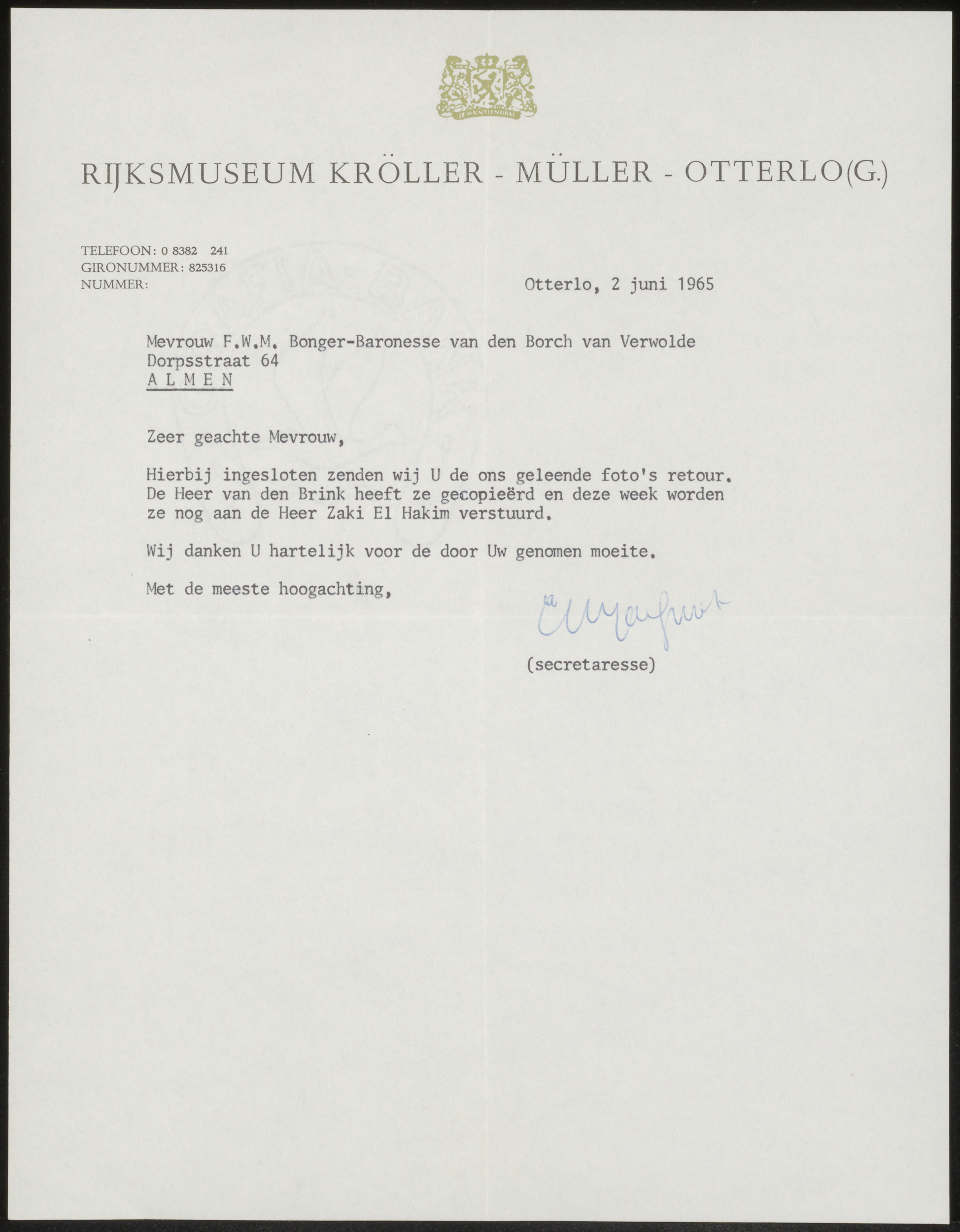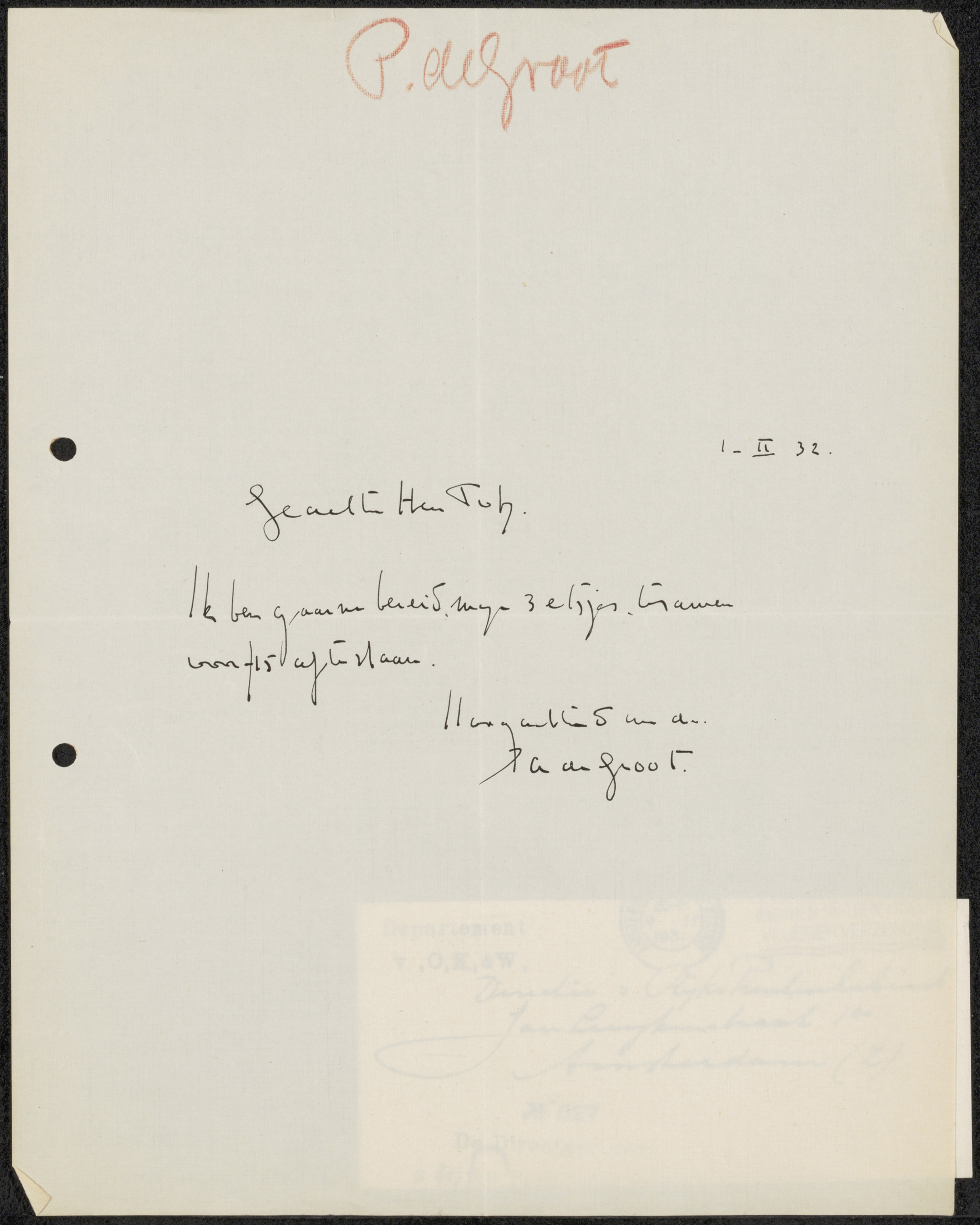 Brief aan G.M.C. Hooft, secretaris van de commissie ...