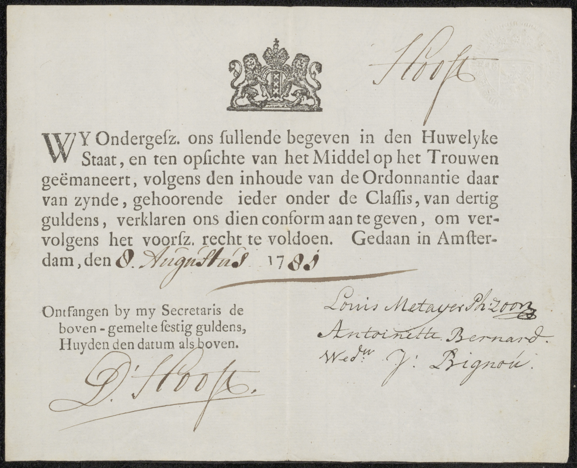Kwitantie voor M.J. van den Hulst
