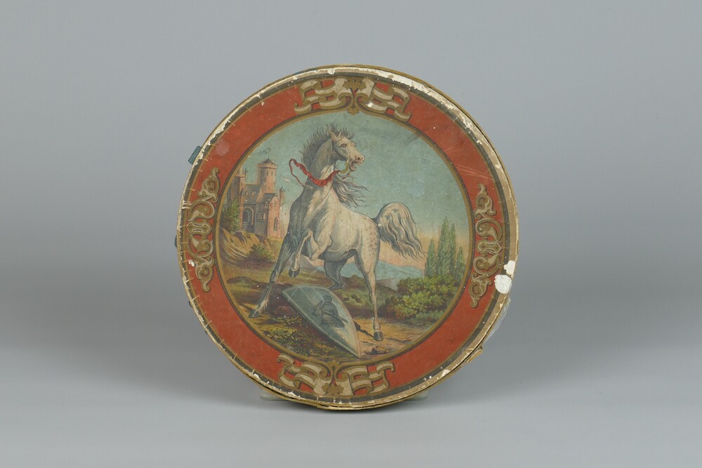 Klok- en hamerspel in ronde doos, laat 19e eeuw.