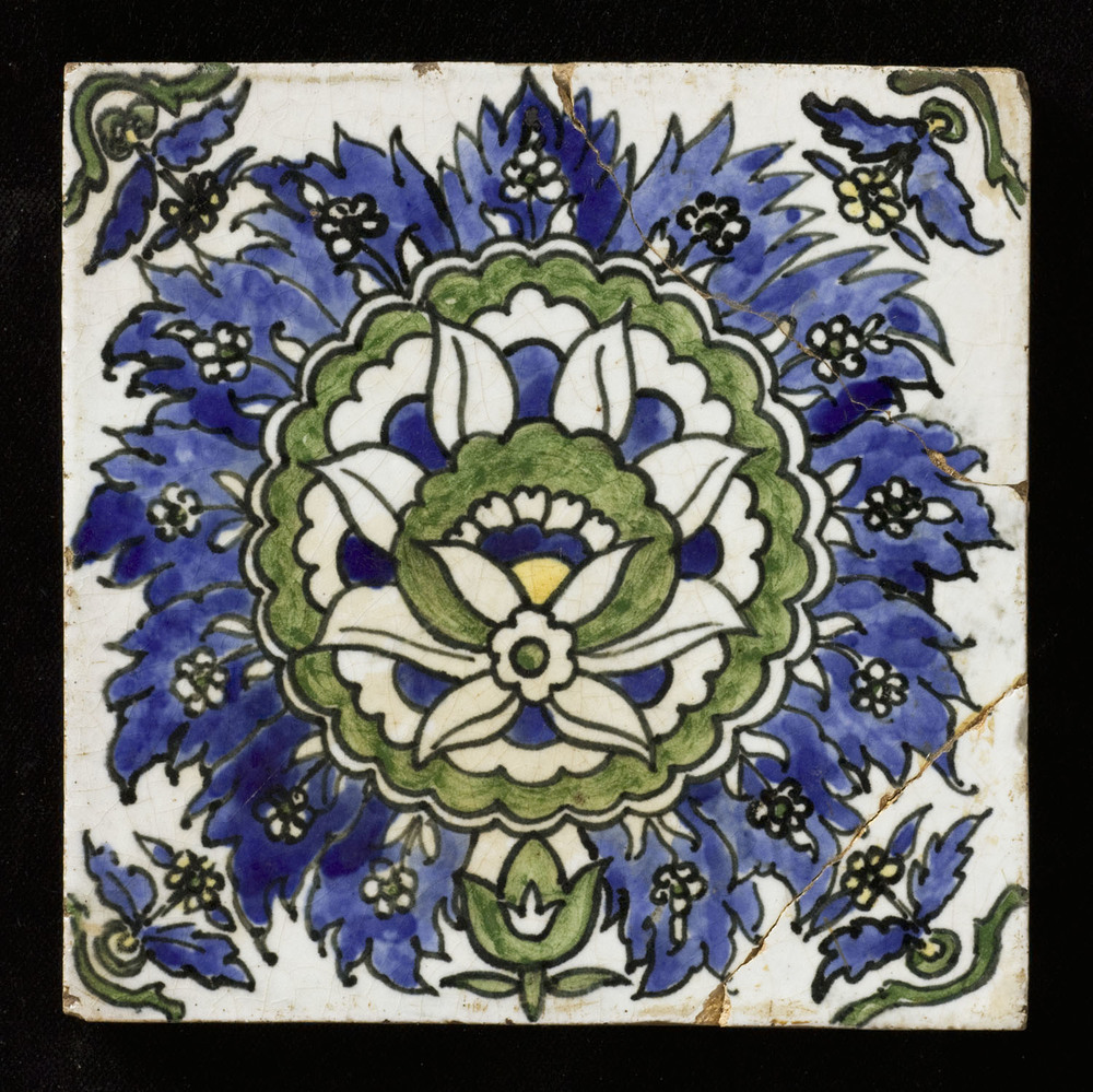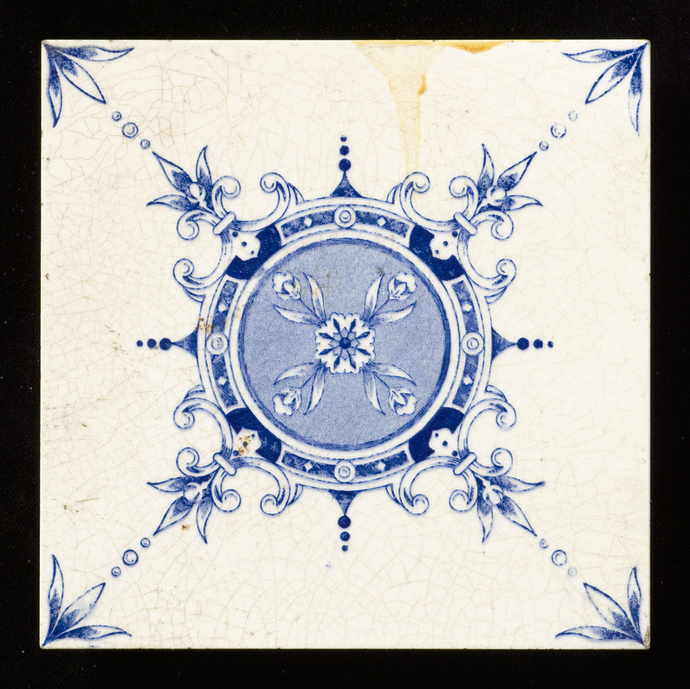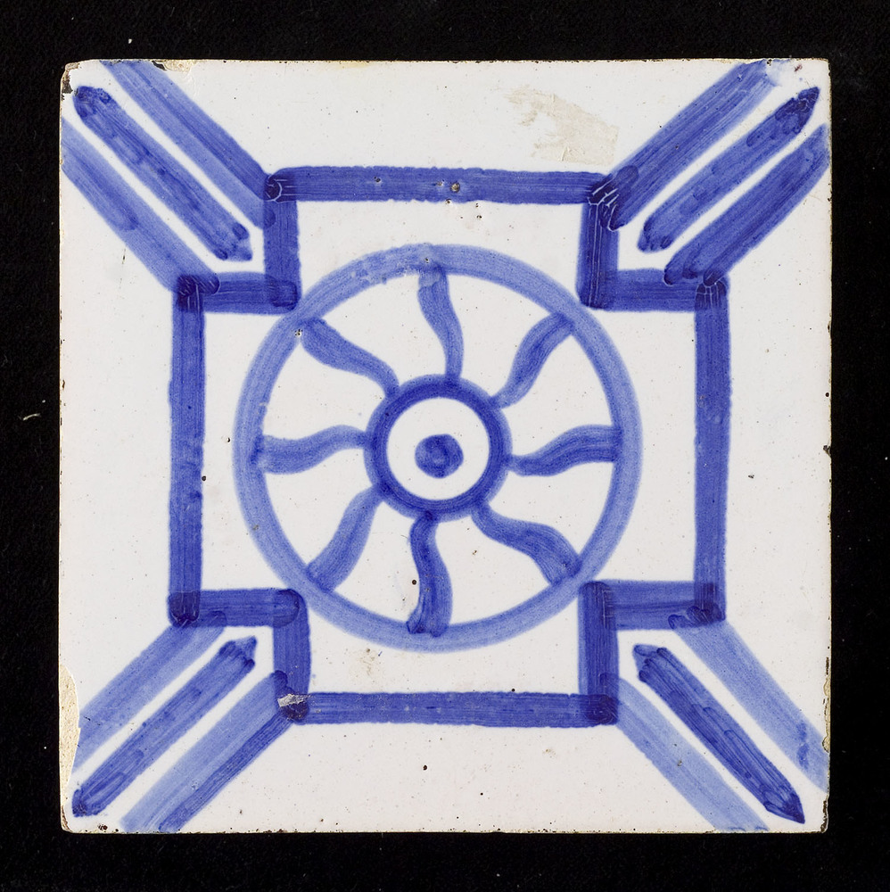 Tegel in tinglazuur, voorstellende ornament met cirk...
