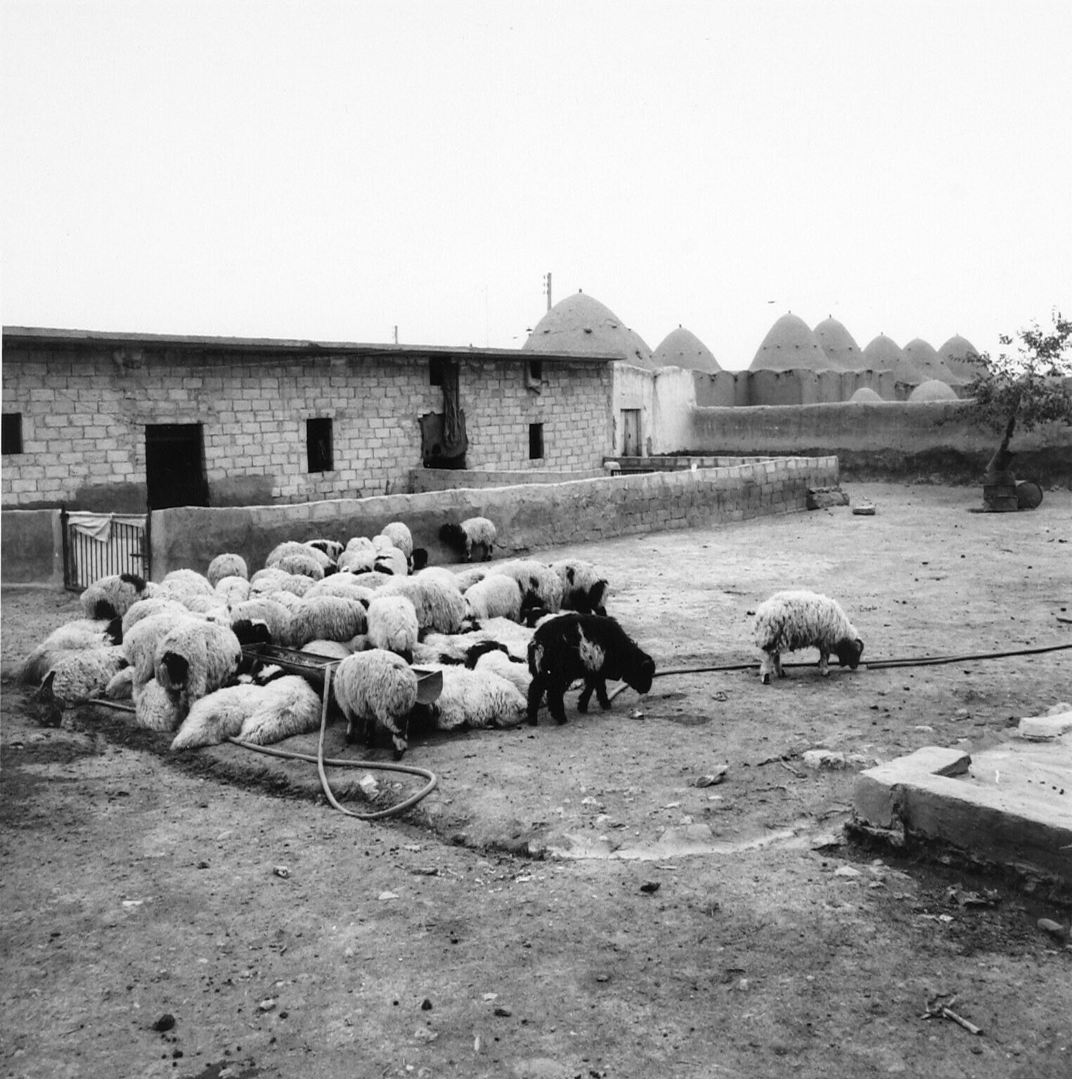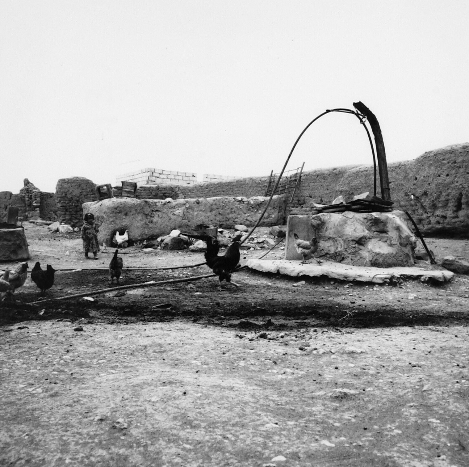 Chickens and a child around a well on a sheep farm
