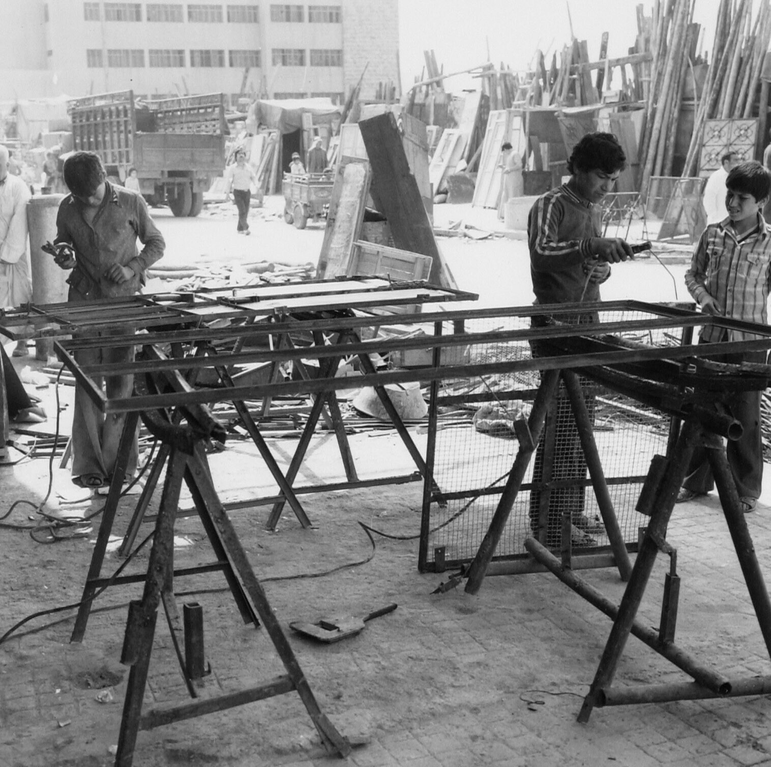 Laswerkplaats op een rommelmarkt met bouwmaterialen