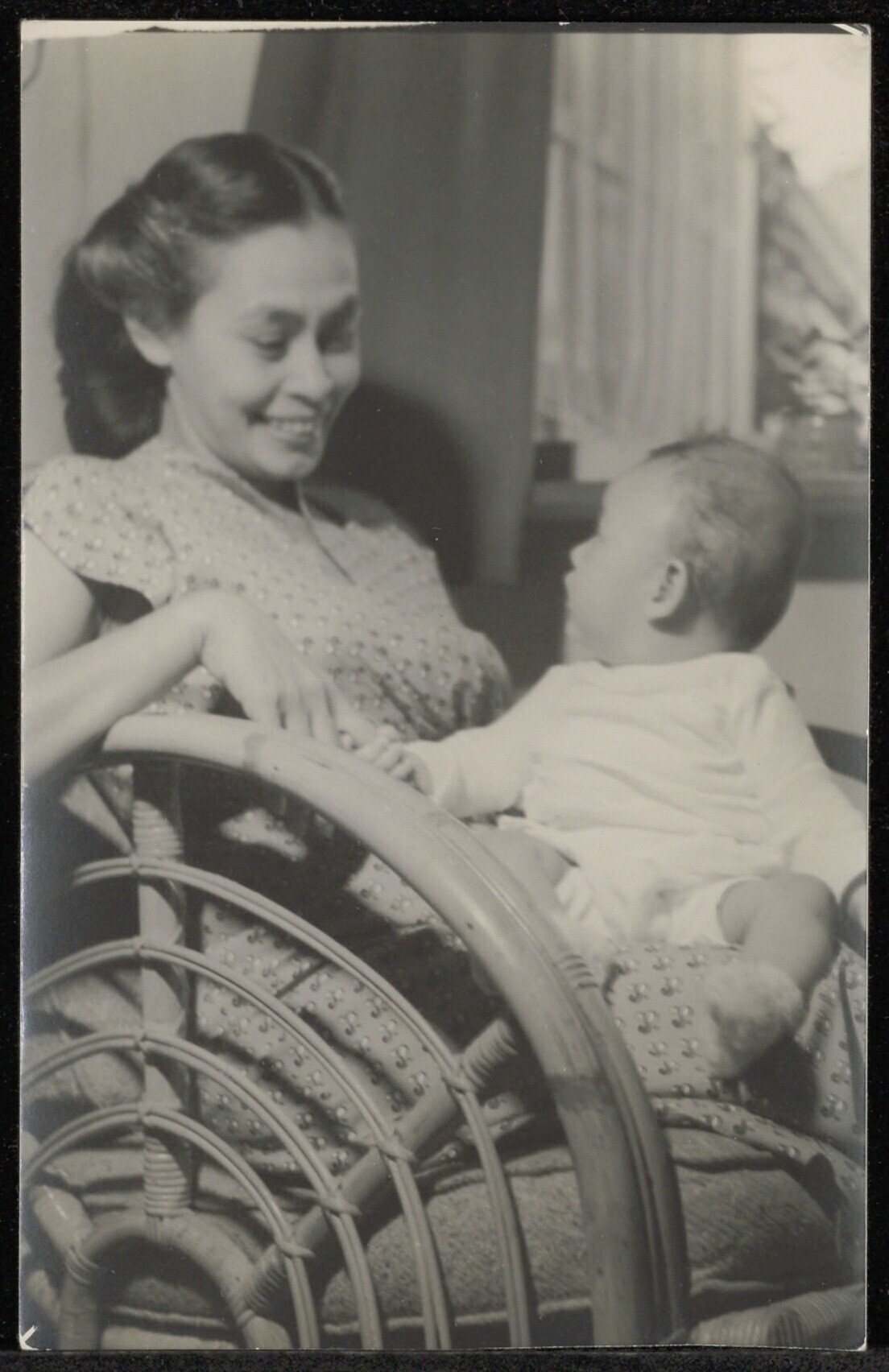 Twee vrouwen met kinderen en twee militairen in kamp...