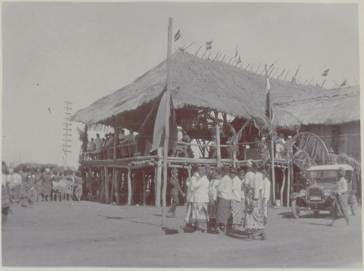 Groep Timorezen bij een tribune tijdens een paardenc...
