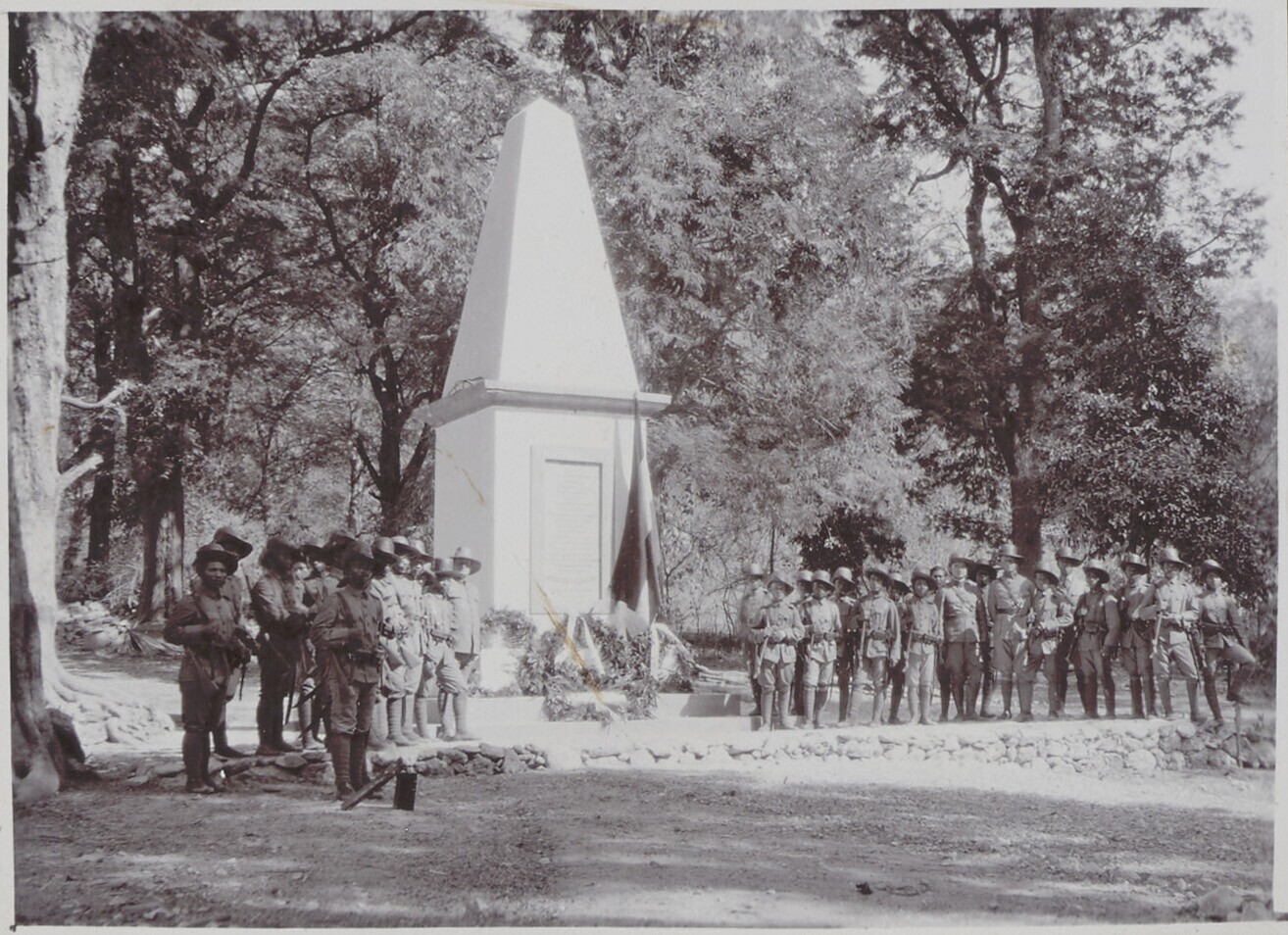 Militairen naast een gedenksteen ter nagedachtenis a...