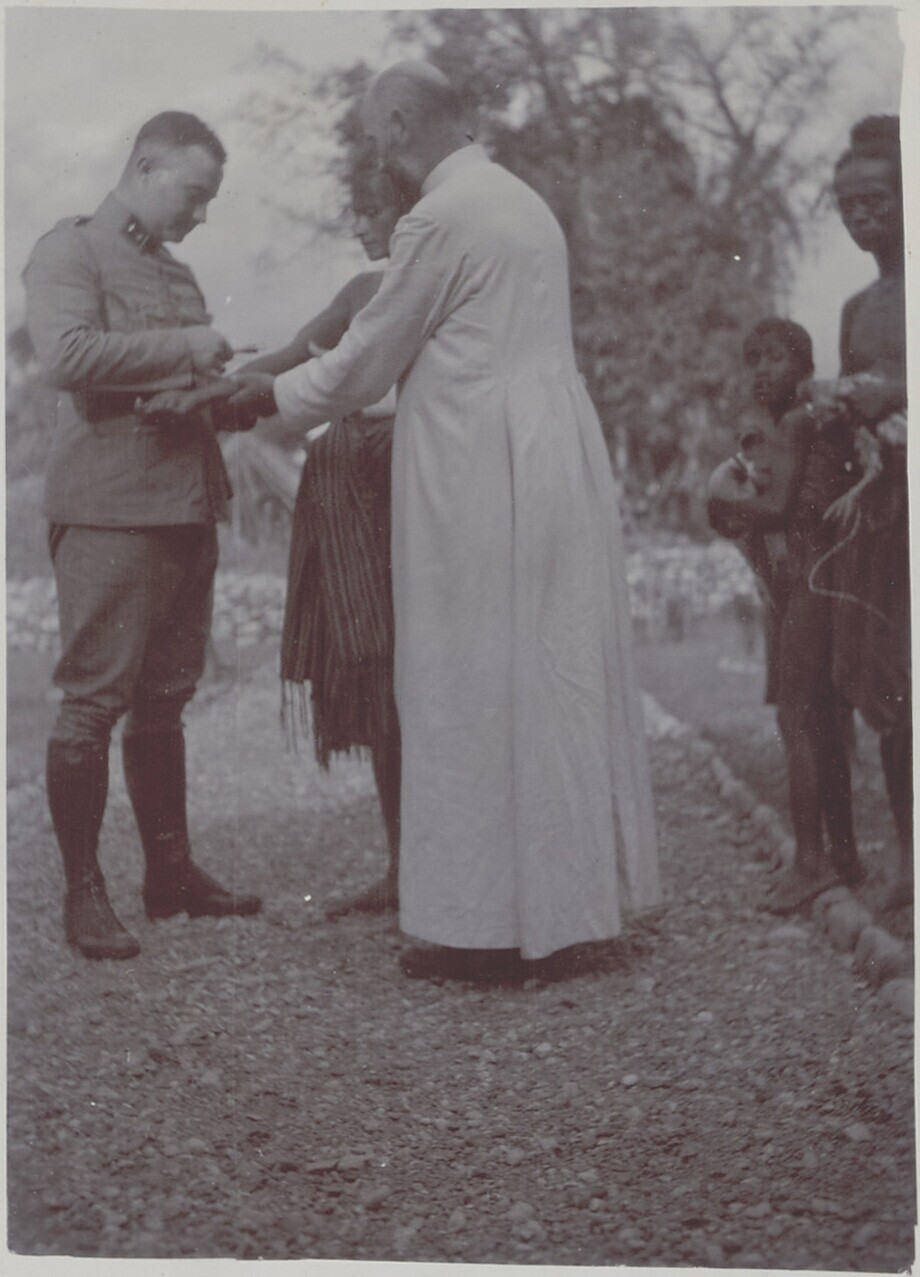 Papoa wordt ingeënt door legerarts bijgestaan door g...