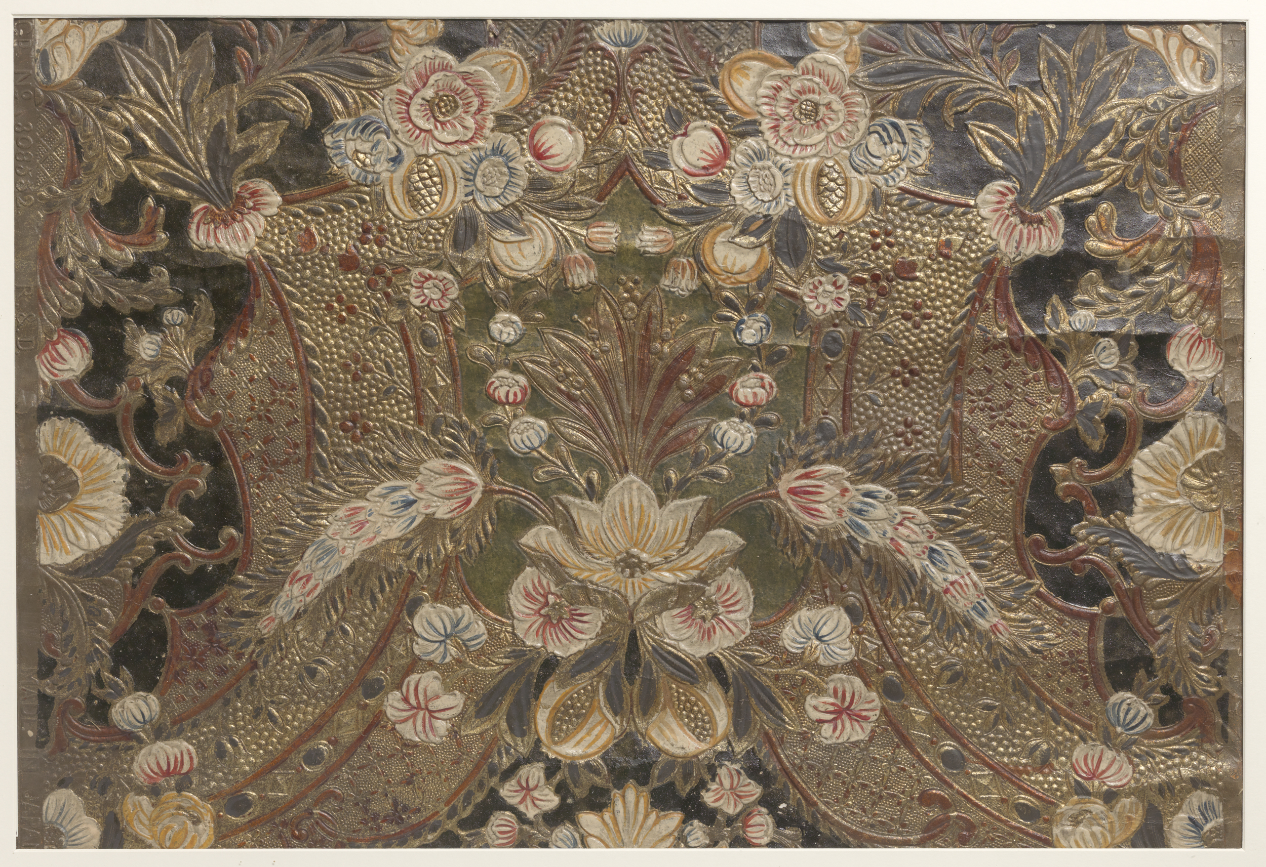 Vel verheven goudleer, gedecoreerd met een festoen, ...