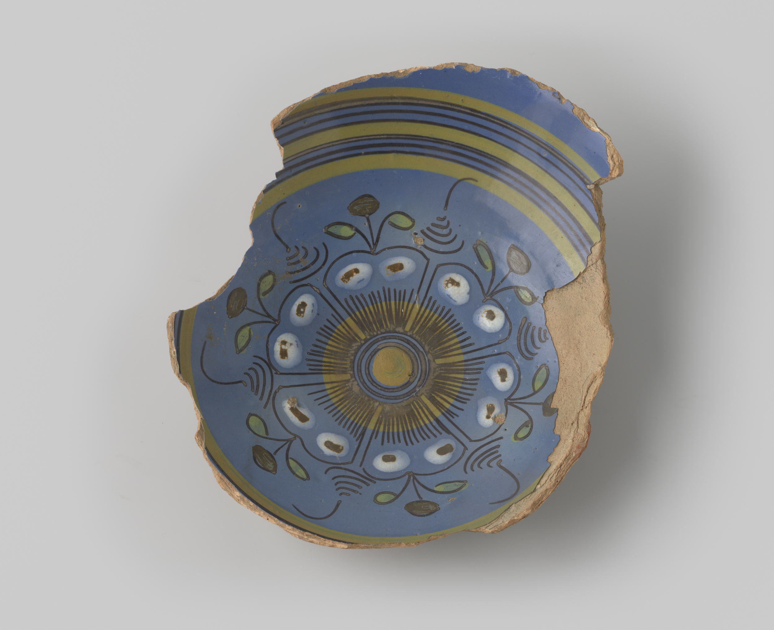 Scherf van geligbakkend aardewerk, met voetring, aan...