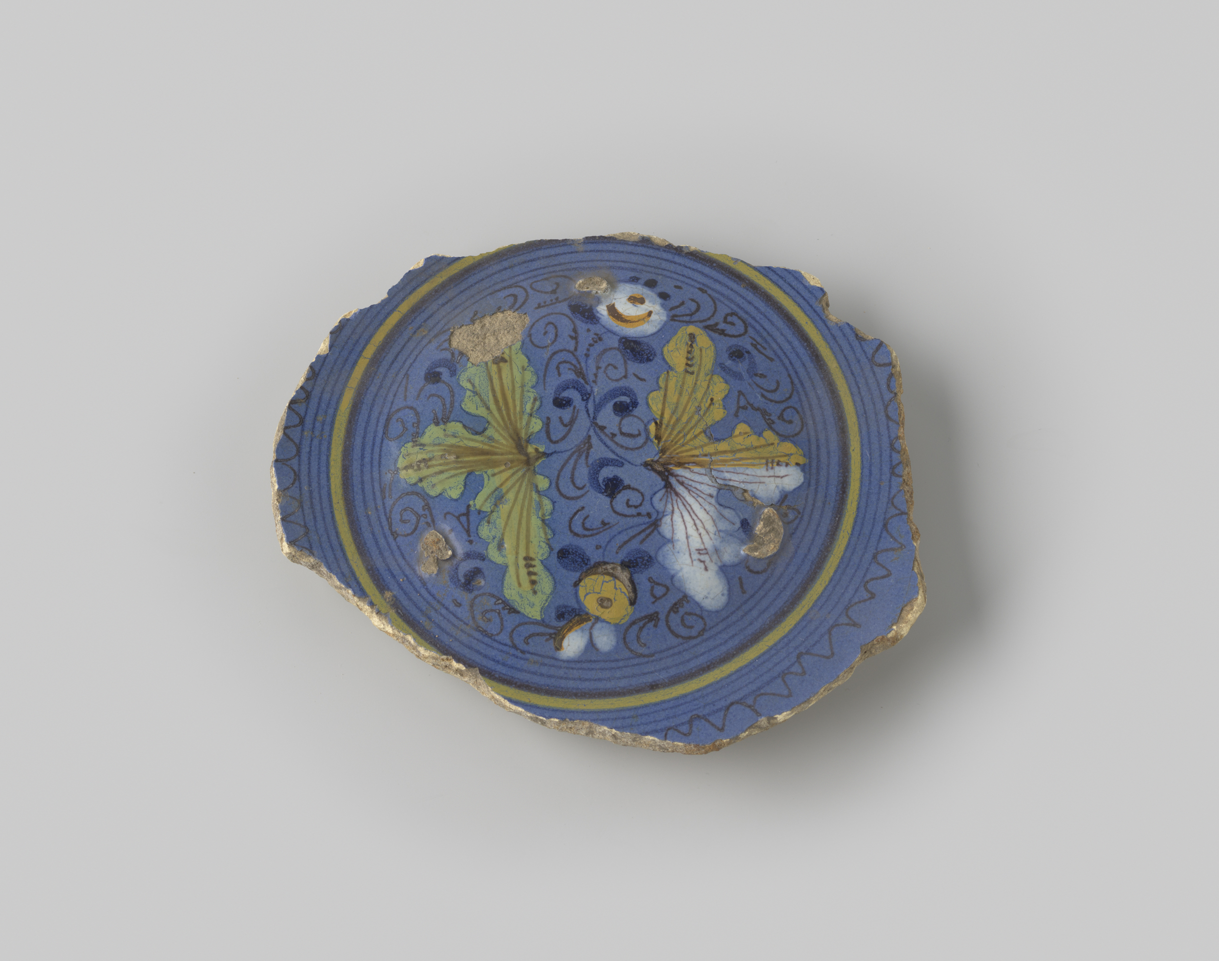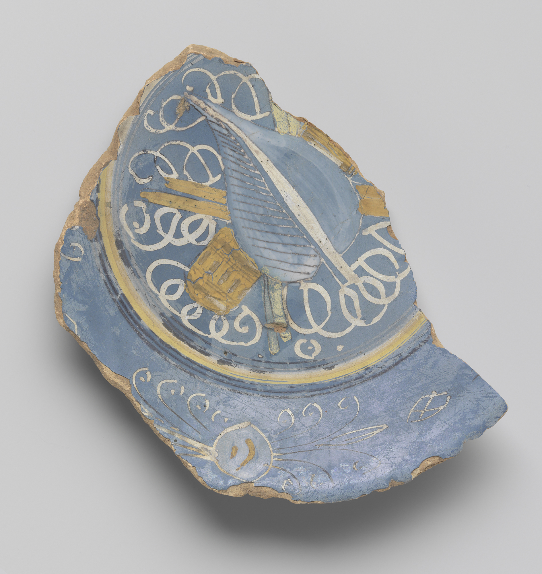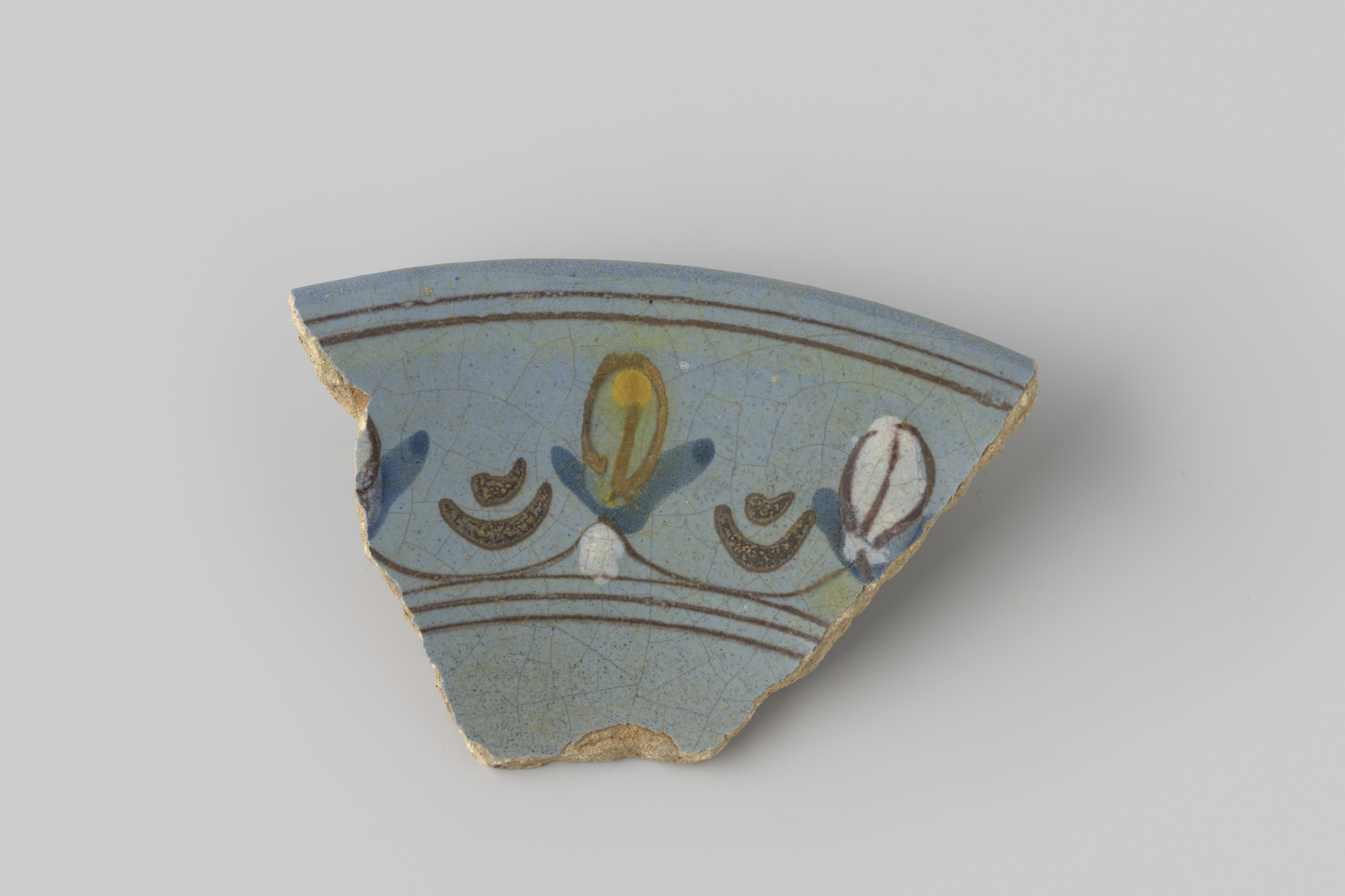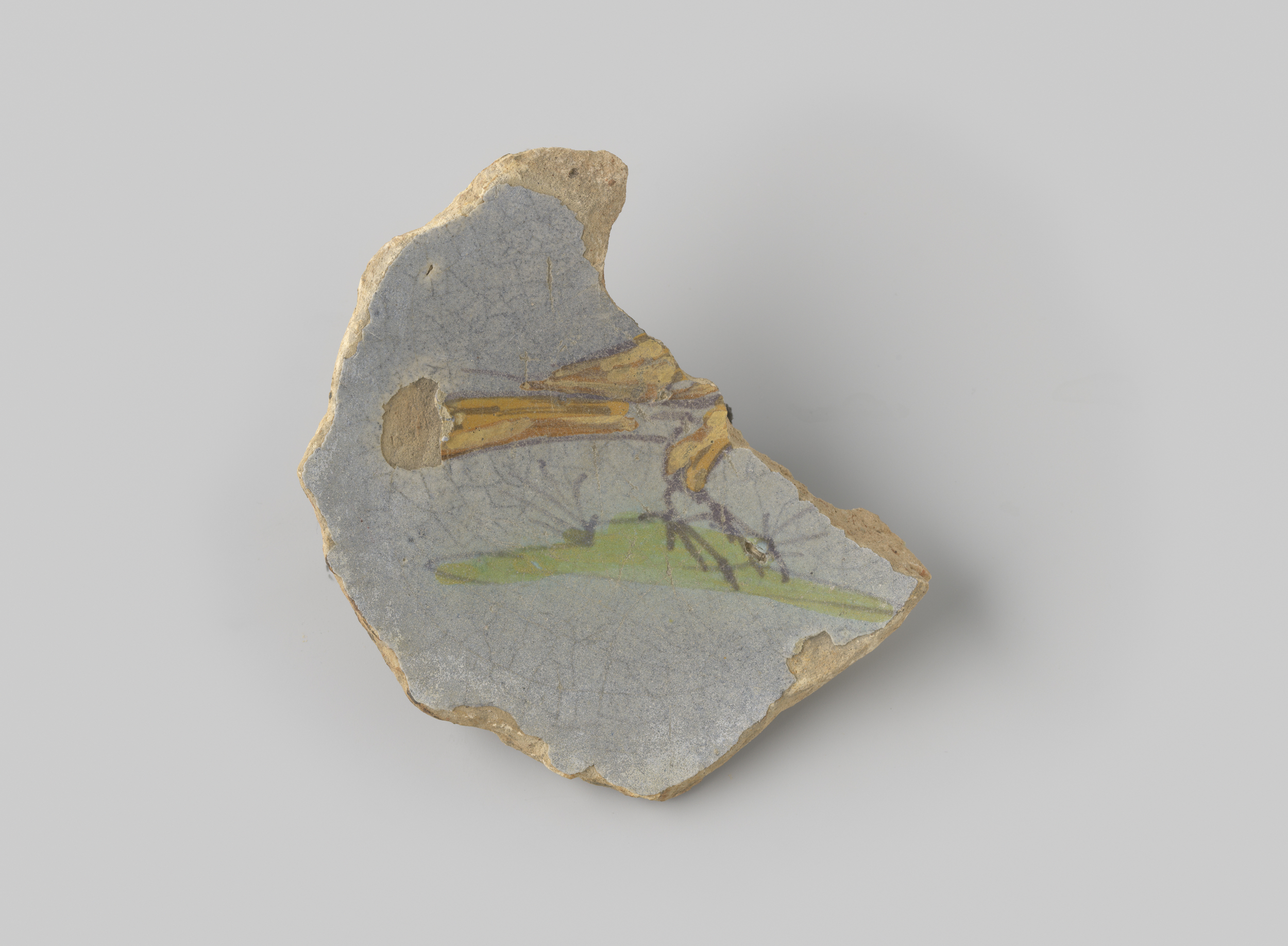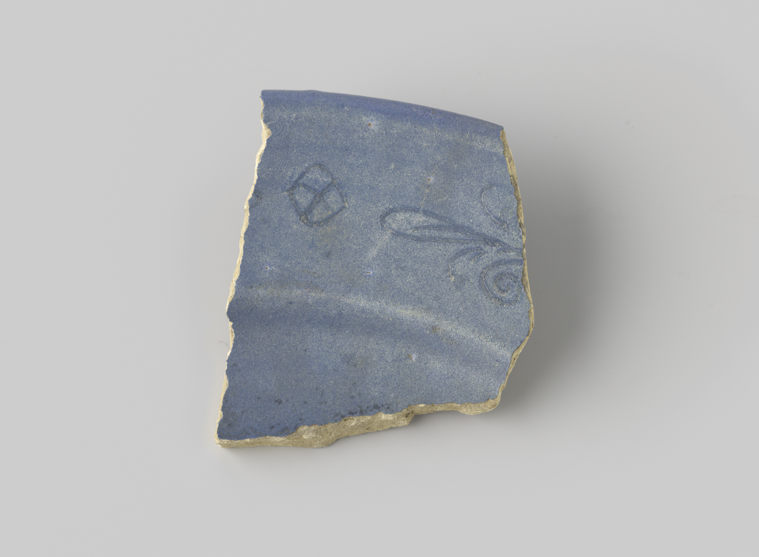 Scherf van witbakkend aardewerk, aan de voorzijde vo...