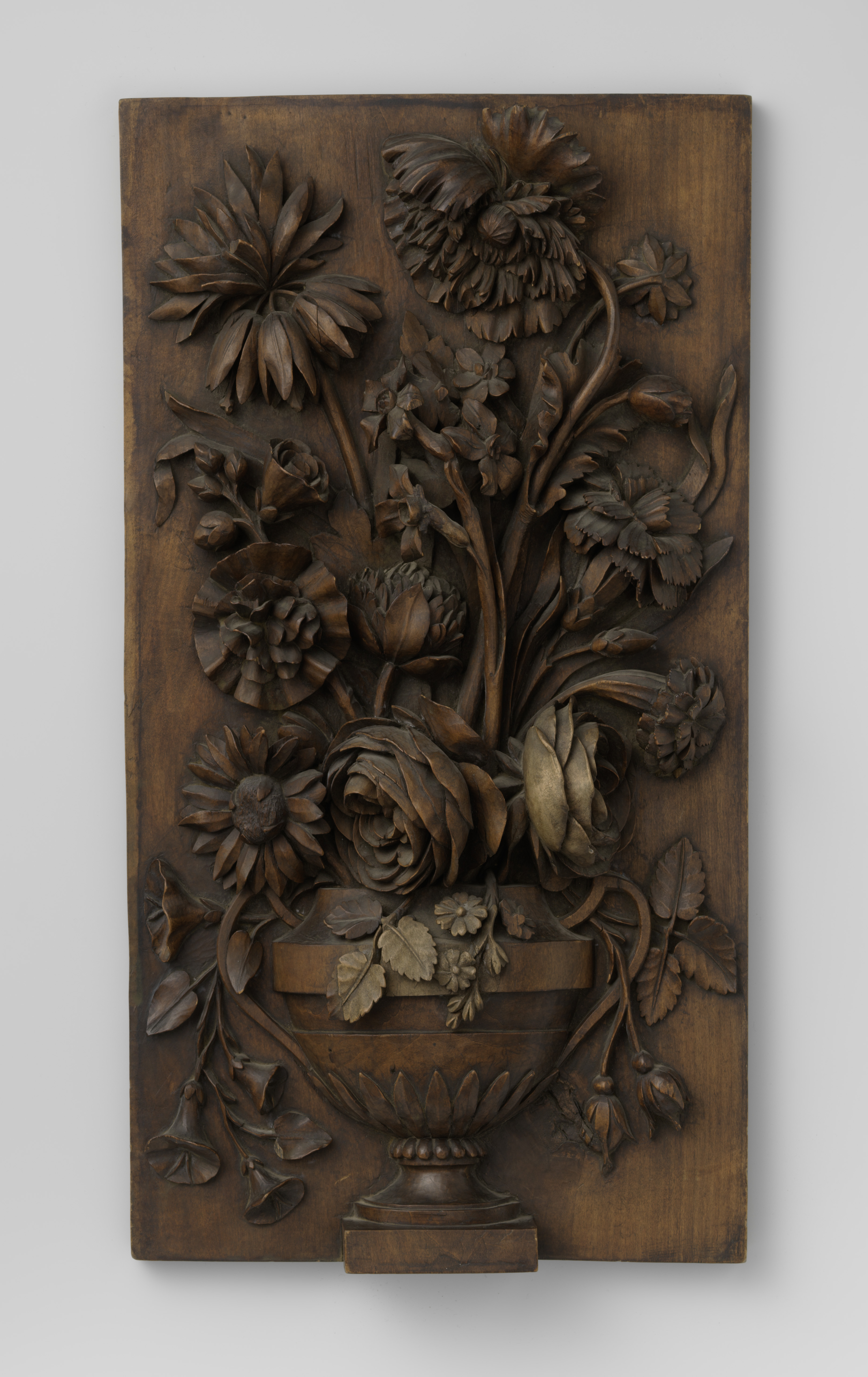 Meubelfragment met in hoog reliëf gesneden bloemenvaas