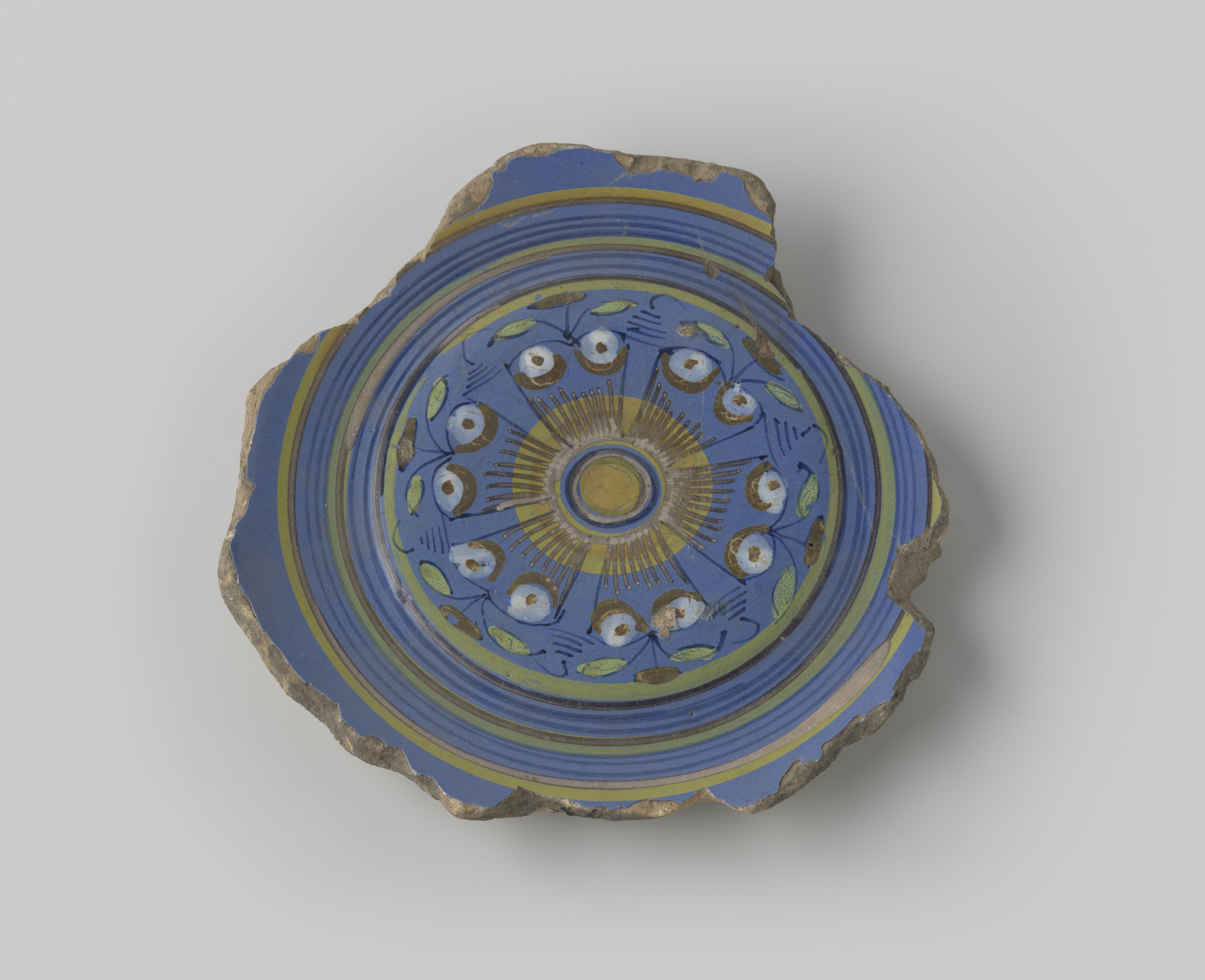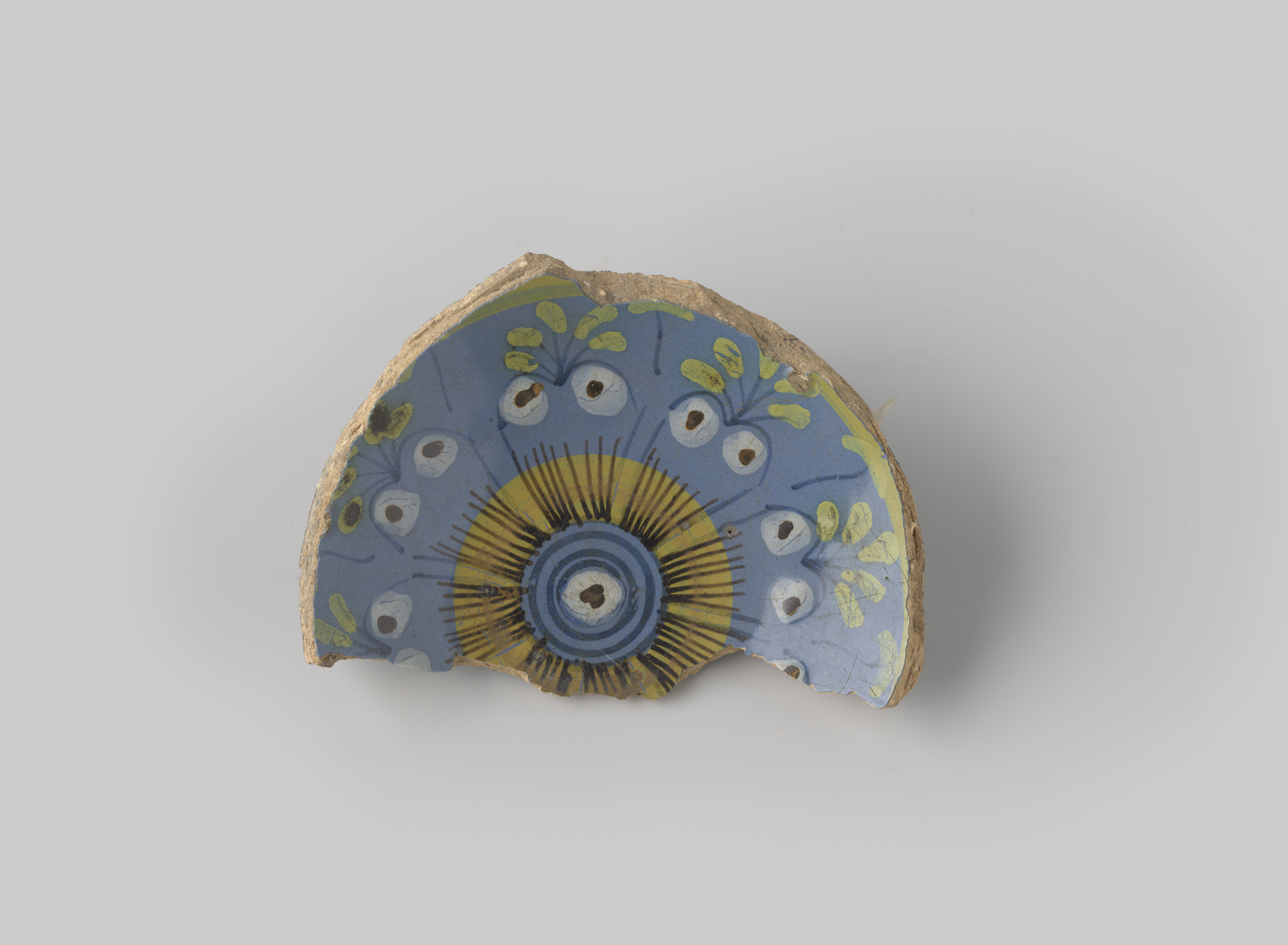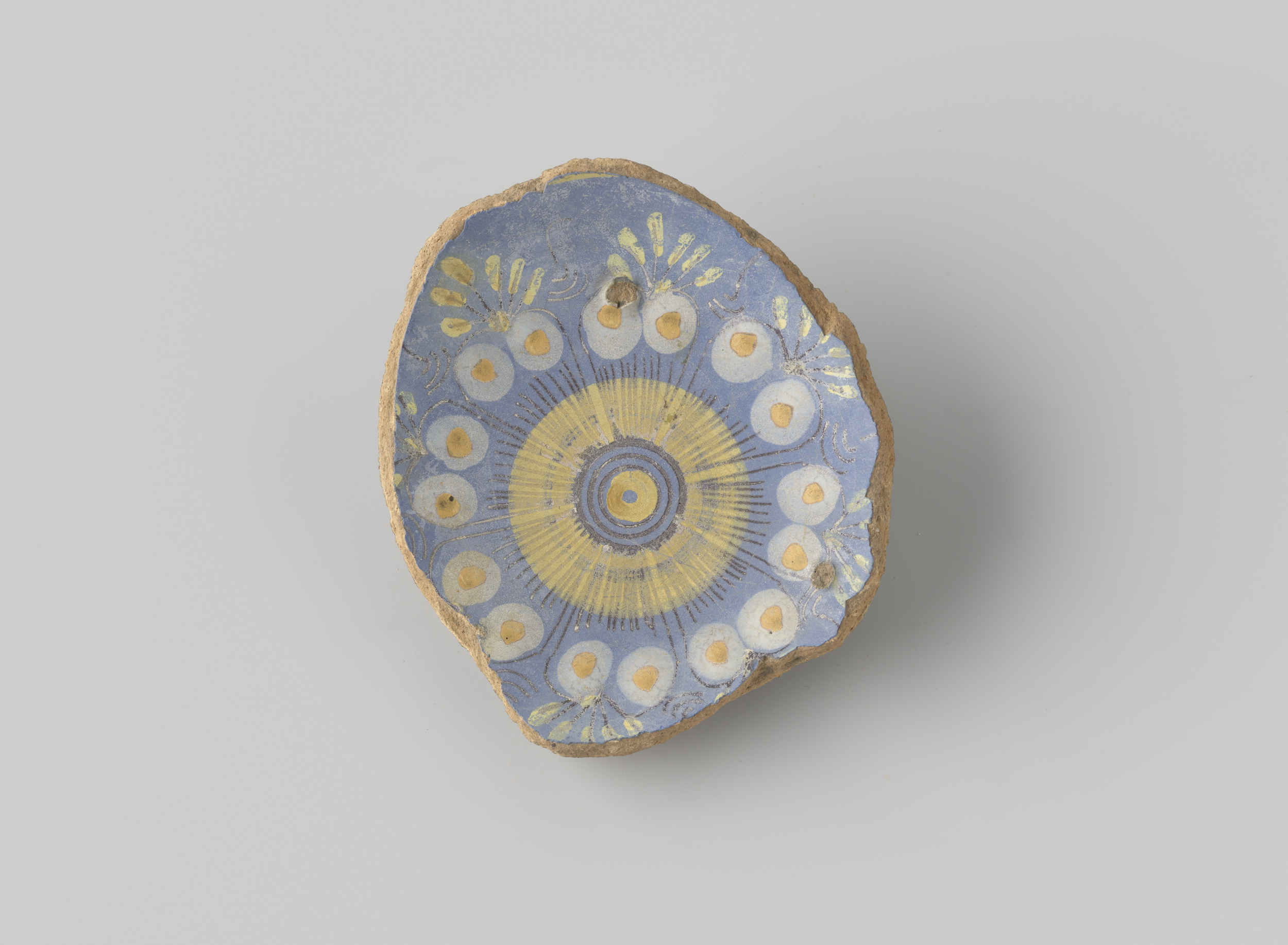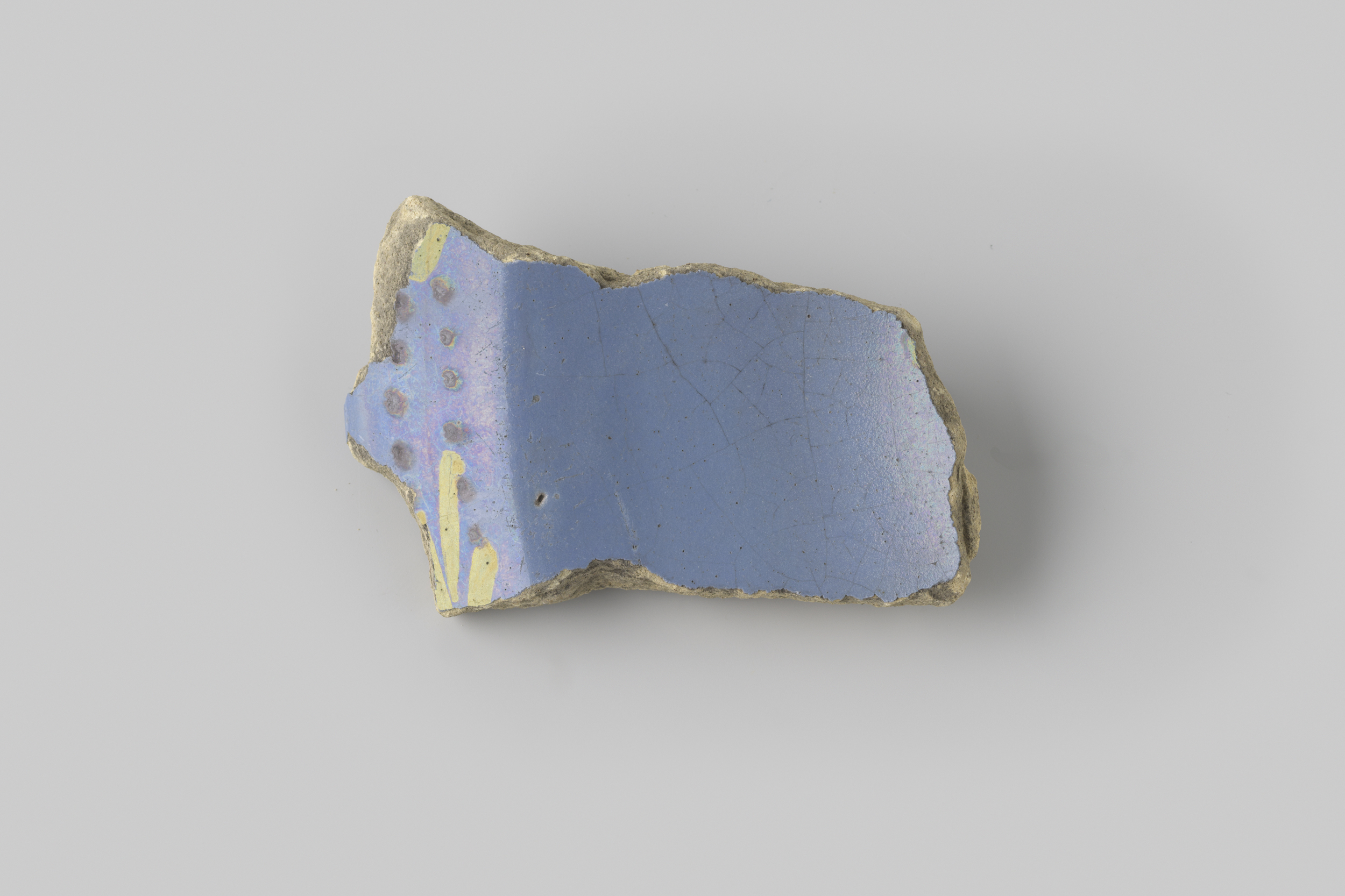 Scherf van geligbakkend aardewerk, aan de voorzijde ...