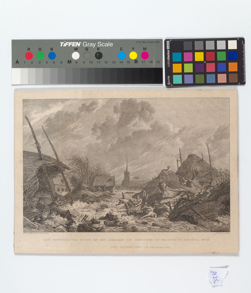 Gravure met afbeelding van de watervloed te Erichem ...