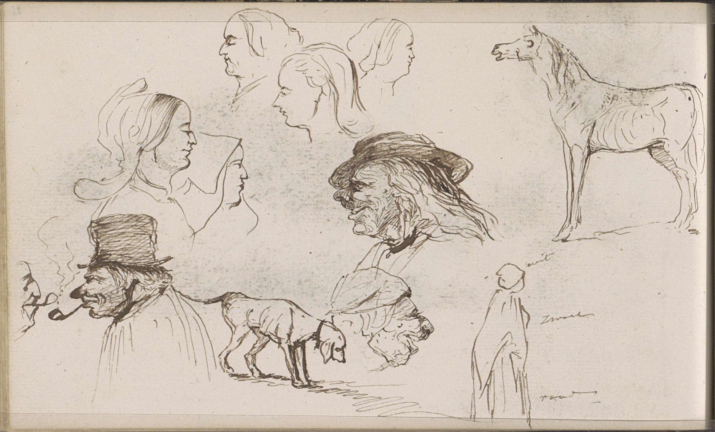 Paard, een hond en mannen- en vrouwenkoppen