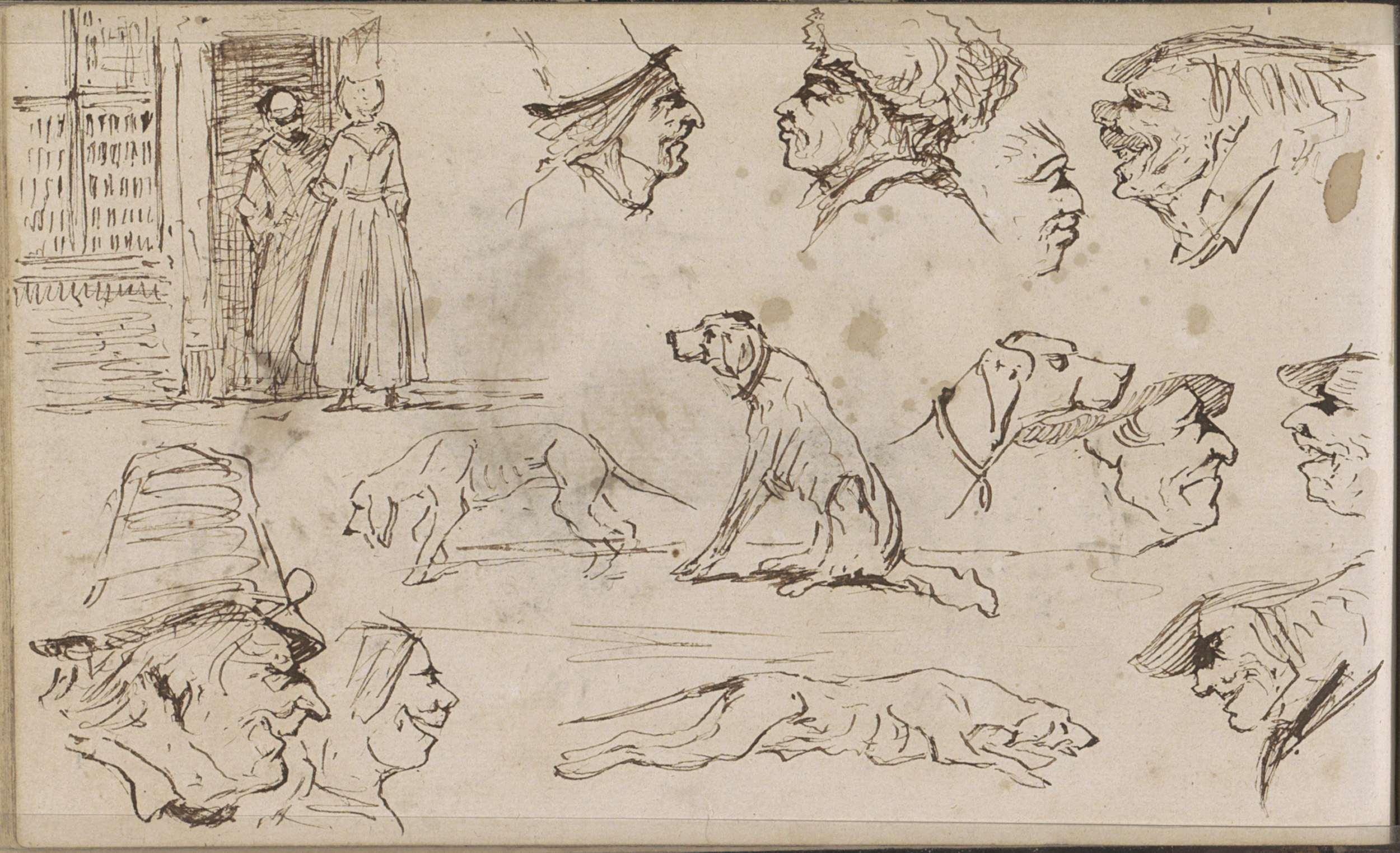 Twee boerinnen in een deuropening, honden en mannen-...