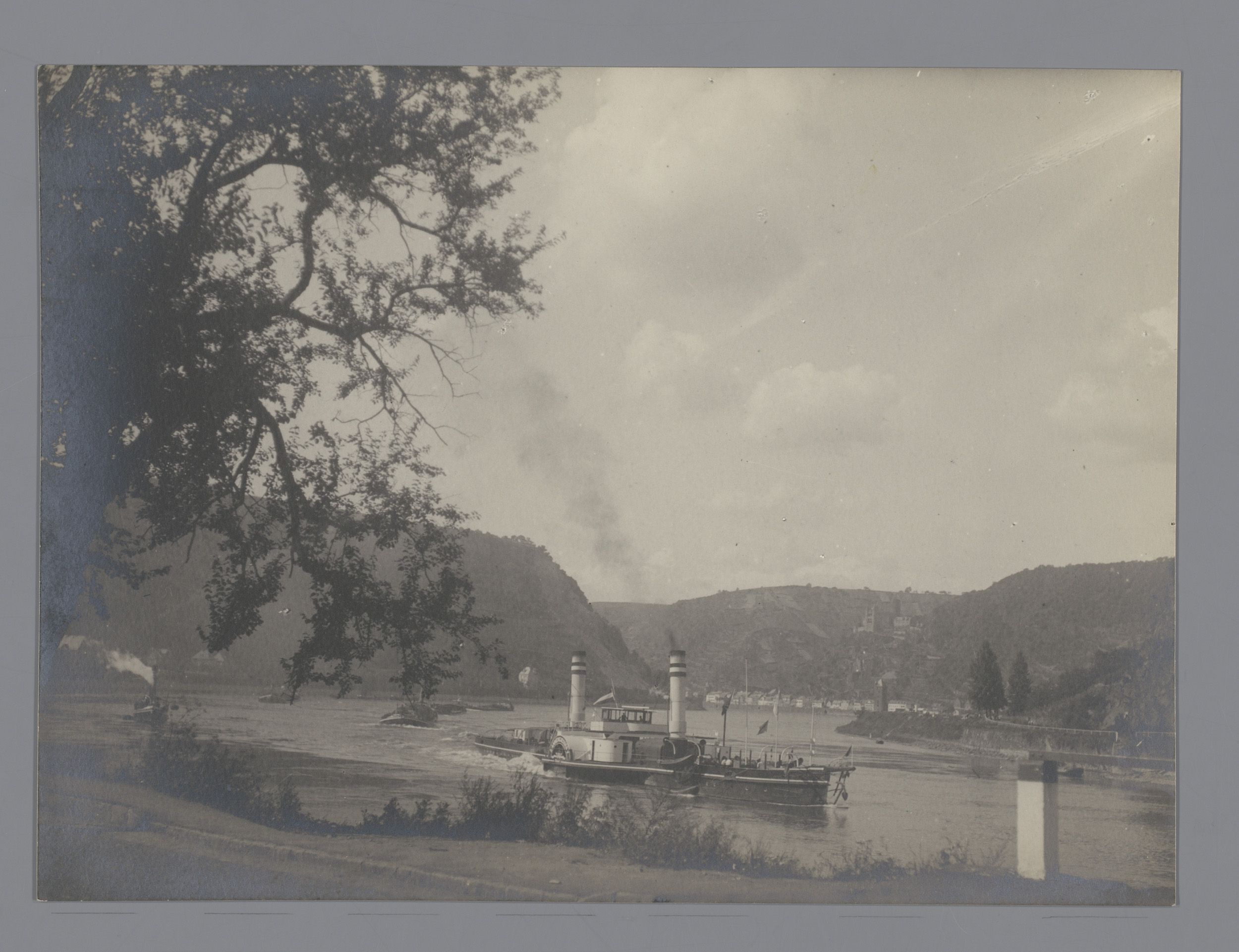 Stoomschip in een rivier, mogelijk de Rijn in Duitsland