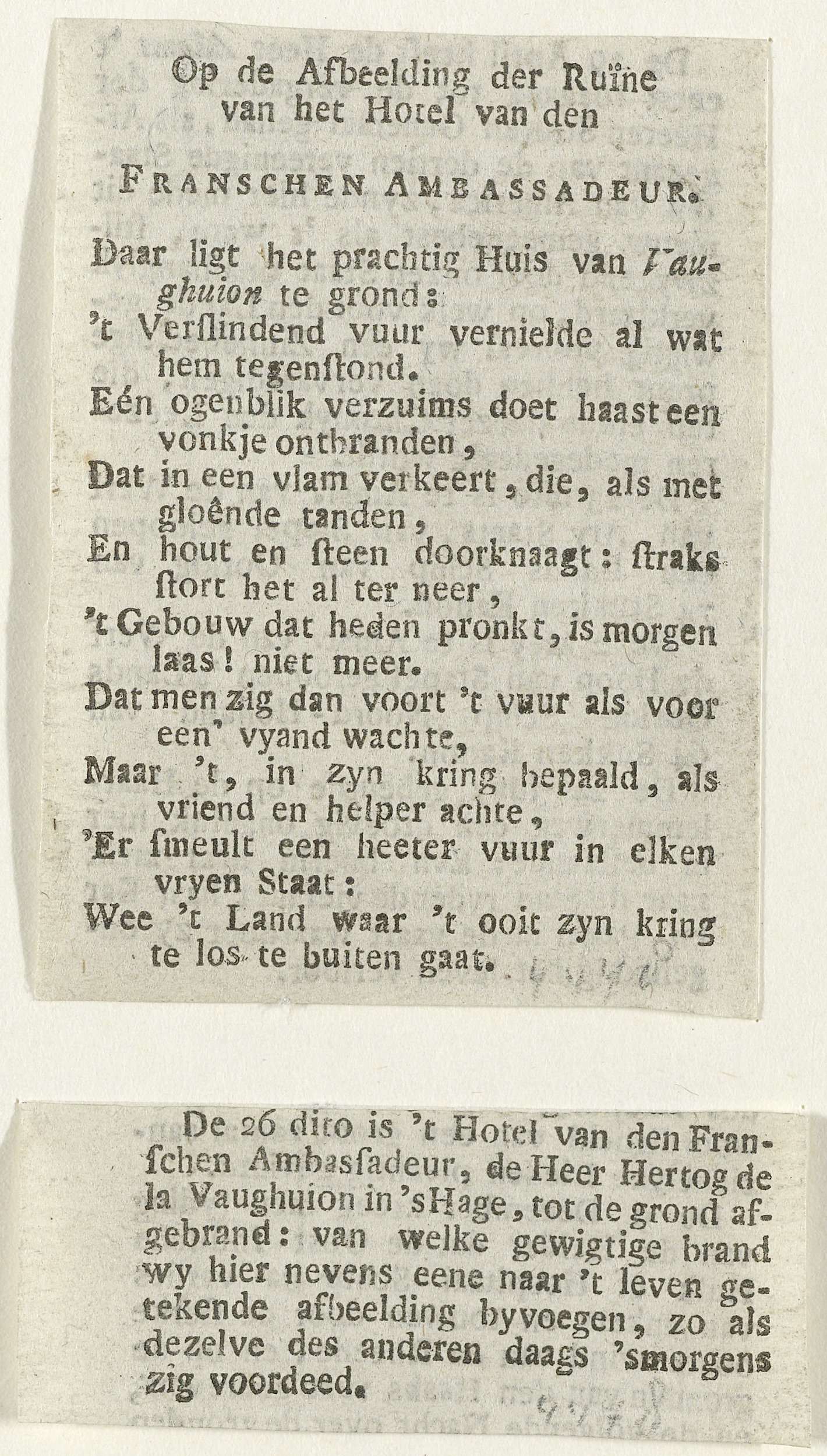 Tekstblad bij de prent van de ruïne van het huis van...
