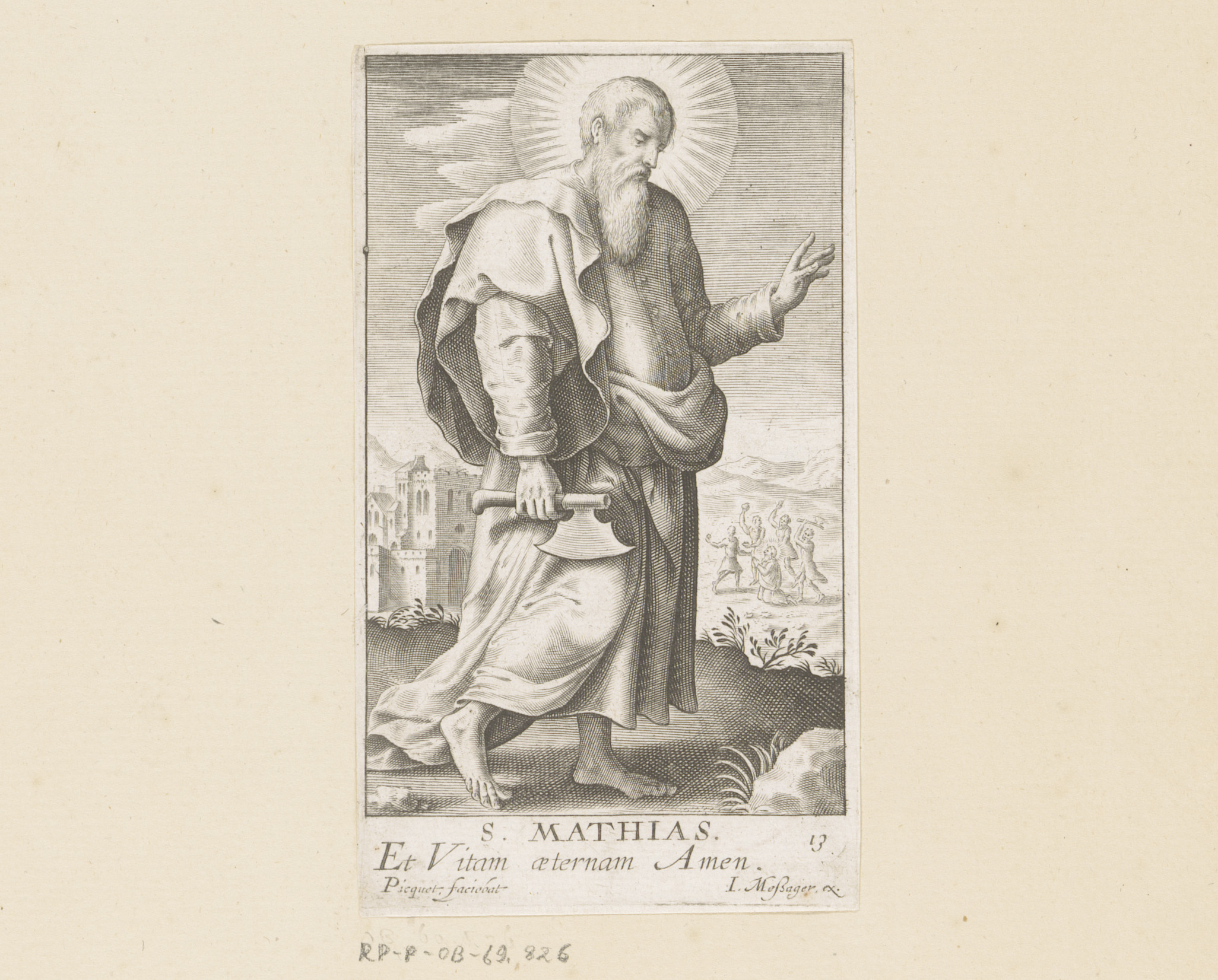 Maria op wolken kijkt neer op bedelmonnik met het Ki...